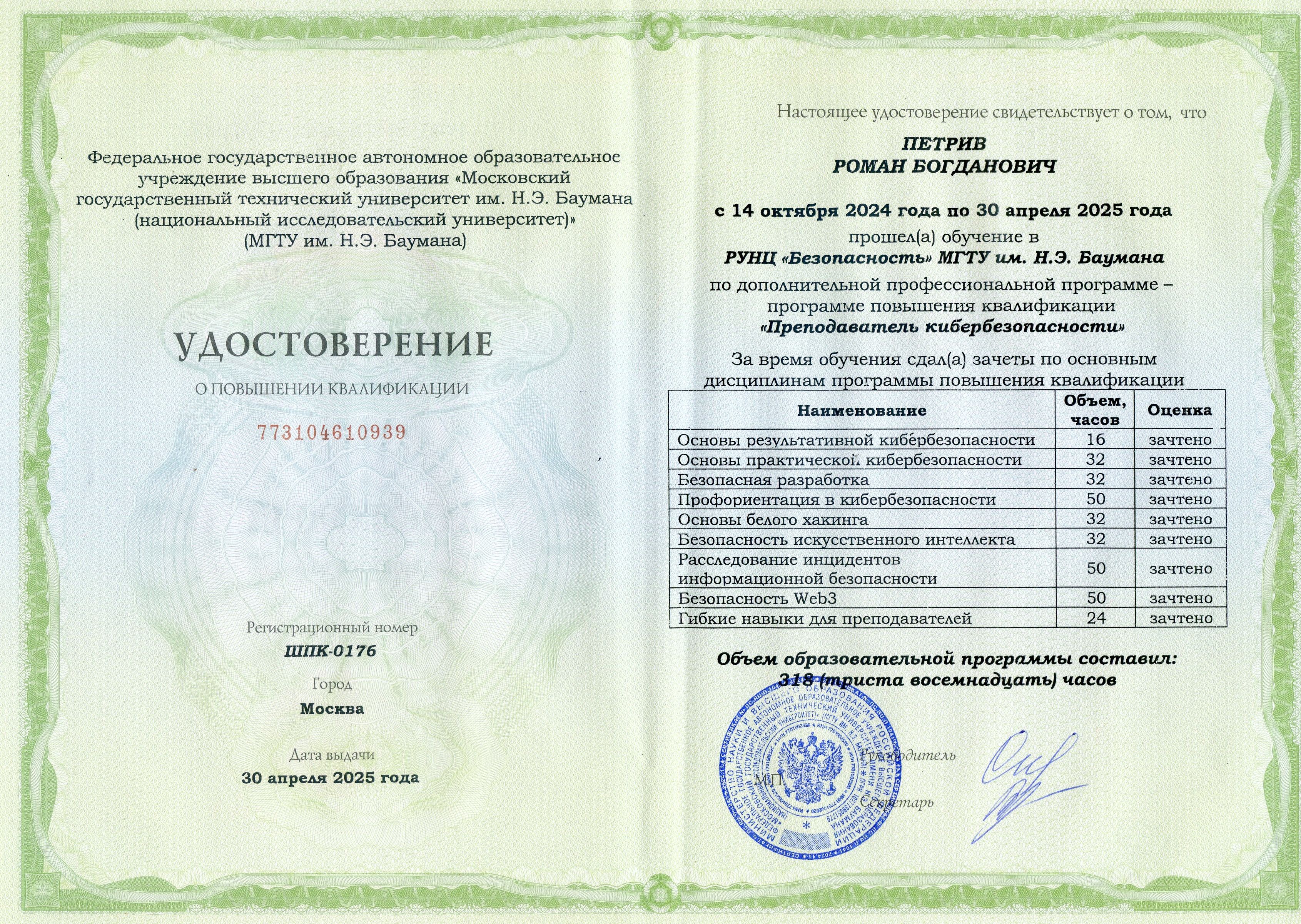 Старший преподаватель кафедры защищённых систем связи СПбГУТ Роман Петрив завершил обучение в Школе преподавателей кибербезопасности (ШПК), организованной компанией Positive Technologies совместно с МГТУ имени Н. Э. Баумана. Вручение удостоверений о повышении квалификации лучшим выпускникам состоялось 24 мая в Москве в рамках Positive Hack Days Fest, где также участвовали студенты СПбГУТ.