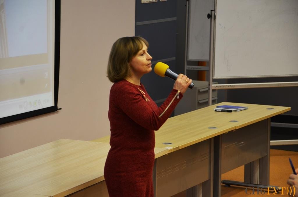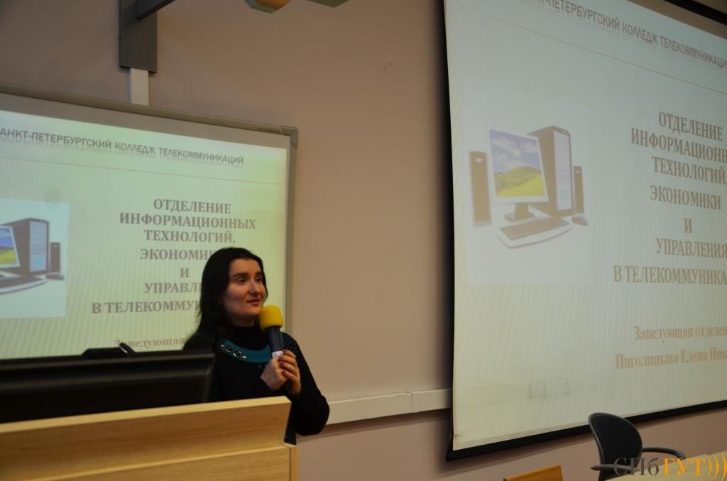 Начальник отдела профориентации и довузовской подготовки СПбГУТ Татьяна Викторовна Дробинина разъяснила, что представляет собой система «колледж-вуз», а также представила профориентационные проекты университета – бесплатные факультативные занятия для школьников и олимпиада «Телеком-планета».