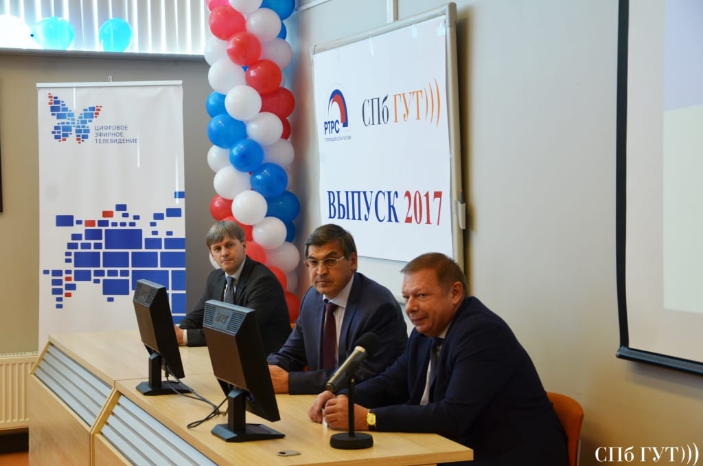 На заседании ГЭК в этот день присутствовали представители компании-партнера университета: Николай Степанович Фуксин – директор департамента кадровой политики РТРС, Андрей Владимирович Кусачев – заместитель директора департамента кадровой политики РТРС, Елена Андреевна Авдеенко – начальник отдела обучения РТРС, Руслан Николаевич Евсеев - директор филиала РТРС "Санкт-Петербургский РЦ", Николай Иванович Гук – заместитель директора филиала РТРС «Санкт-Петербургский РЦ», Алексей Владимирович Вербицкий – заместитель главного инженера филиала РТРС «Санкт – Петербургский РЦ». После защиты выпускников поздравили заведующий базовой кафедрой ЦТРВ Р.Н. Евсеев и заведующий кафедрой ТВ и М А.А. Гоголь.