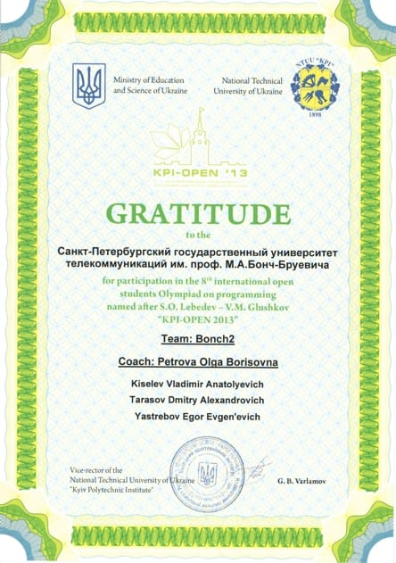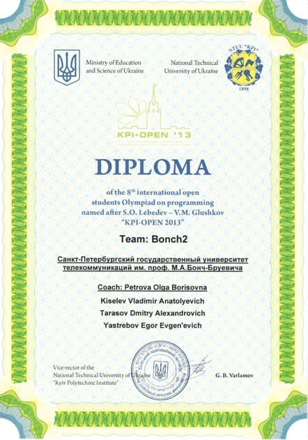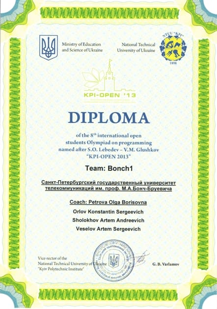 Олимпиада KPI-OPEN 2013 проходила в г. Киеве с 1 июля по 6 июля 2013 г. Организатор олимпиады — Национальный технический университет Украины «Киевский политехнический институт». От СПбГУТ в олимпиаде участвовали две команды студентов «Бонч-1» и «Бонч-2». В составе команды «Бонч-1» выступали студенты 3 курса, группы СП-01: Артём Шолохов, Константин Орлов, Артём Веселов. За команду «Бонч-2» выступали студенты 1 курса группы СП-22 Егор Ястребов, Владимир Киселев, Дмитрий Тарасов. Тренер команды программистов, доцент кафедры цифровой вычислительной техники и информатики О.Б. Петрова.