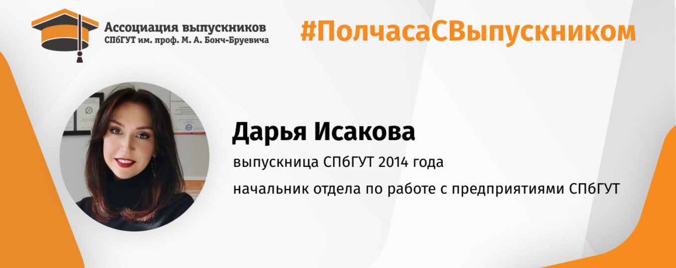 Новая участница проекта «Полчаса с выпускником» – Дарья Исакова, выпускница СПбГУТ 2014 года. Она возглавляет университетский отдел по работе с предприятиями и знает все о трудоустройстве студентов и выпускников. Мы попросили Дарью рассказать о себе и поделиться советами о построении успешной карьеры.