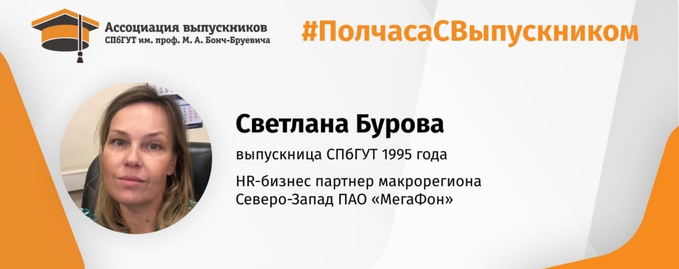 Участница проекта «Полчаса с выпускником» – Светлана Бурова, выпускница нашего университета 1995 года. Она работает в компании «МегаФон», партнере СПбГУТ, где много лет занимается HR-менеджментом, помогая людям достигать высоких целей.