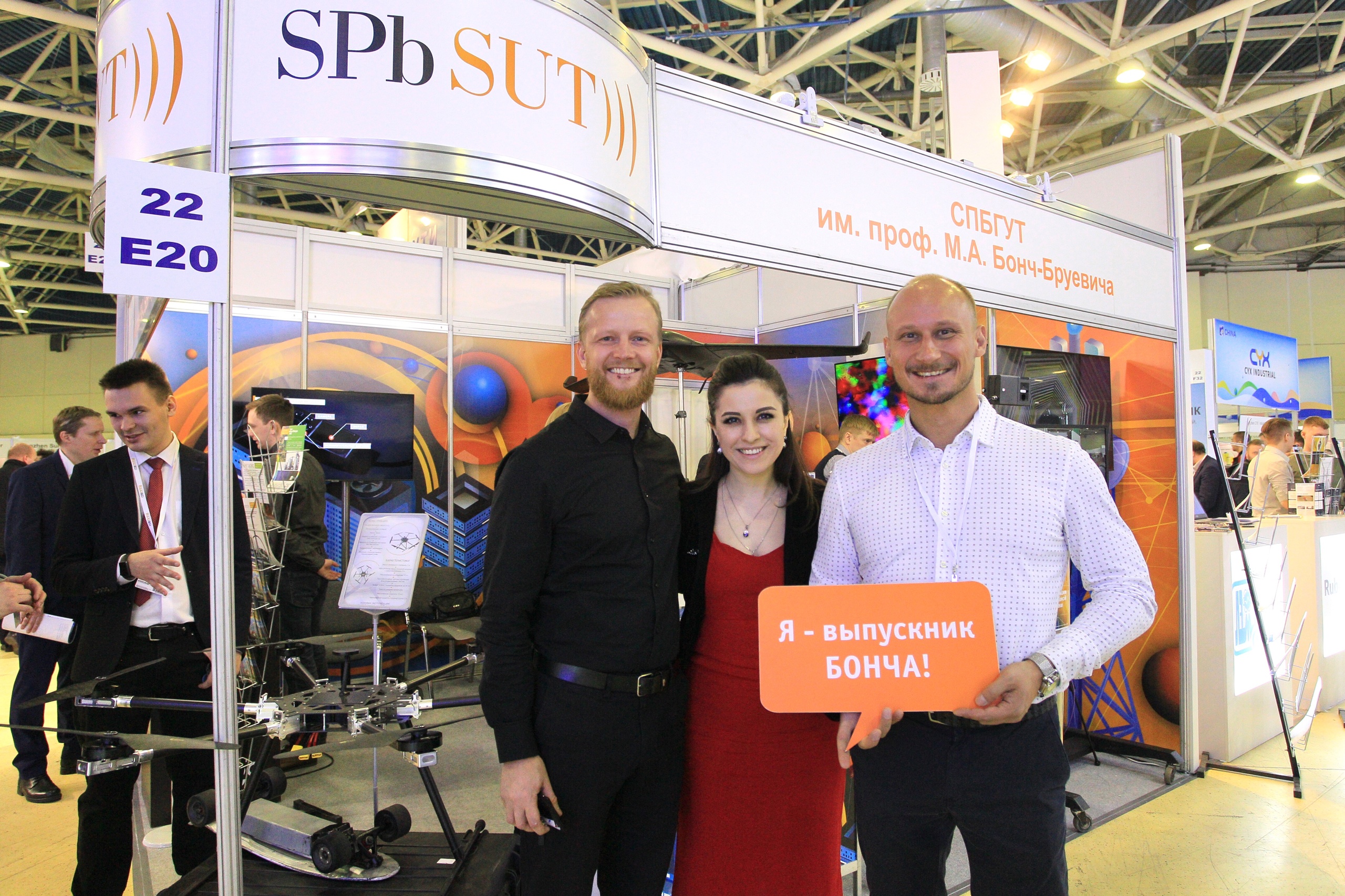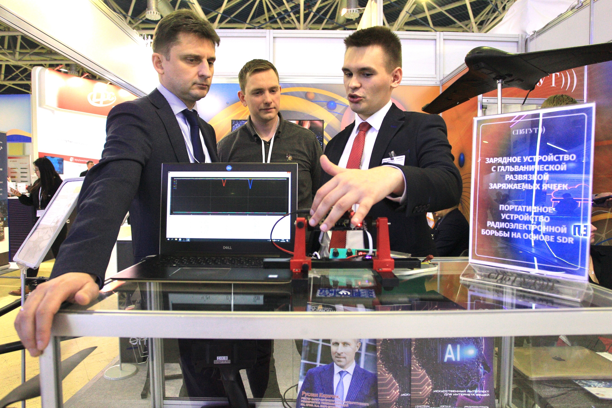 Санкт-Петербургский университет презентовал комплекс научно-технических экспонатов. На стенде СПбГУТ были представлены платформа видеоаналитики CAMAI, беспилотный летательный аппарат, портативное устройство радиоэлектронной борьбы на основе технологии SDR, система визуализации генеративной графики, зарядное устройство с гальванической разрядкой заряжаемых ячеек, а также совместные разработки СПбГУТ и Omega.Future: информационно-аналитическая система «Ивиум», «Алкозамок», одноплатный компьютер Neurobox, робот-манипулятор Omegaman и Omegadron.