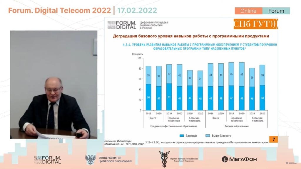 Сергей Бачевский привел данные из отчета «Индикаторы образования: 2022», составленного Институтом статистических исследований и экономики знаний НИУ ВШЭ совместно с Минобрнауки России, Минпросвещения России и Росстатом. Ректор пояснил, что, несмотря на рост количества людей с высшим образованием, кадровый ресурс остается стратегическим, а в структуре подготовки кадров сохраняется дисбаланс, в том числе в отрасли связи. При этом 45% специалистов в области информатизации и связи занимаются самообразованием, стремятся получить новые знания в сфере телекоммуникаций, освоить новые навыки.
