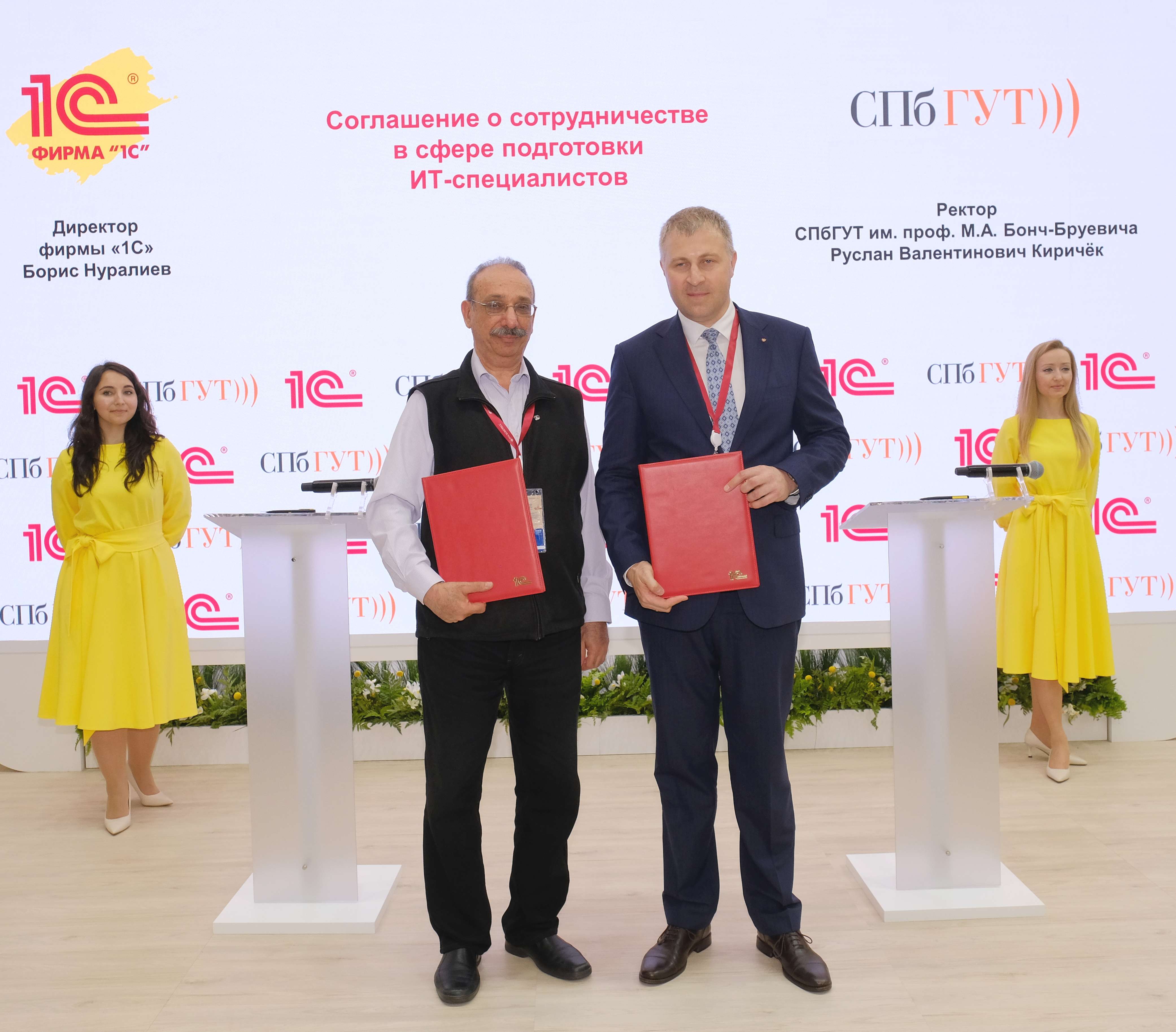 На Петербургском международном экономическом форуме ректор Санкт-Петербургского университета телекоммуникаций Руслан Киричёк и директор фирмы «1С» Борис Нуралиев подписали соглашение о сотрудничестве в сфере подготовки ИТ-специалистов. Ключевым проектом в рамках соглашения станет создание в СПбГУТ Центра Технологий 1С.