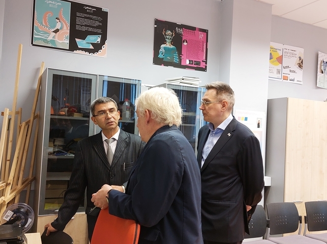 На кафедре информатики и компьютерного дизайна гостя познакомили с лабораторным комплексом по созданию моделей на 3D-принтерах, вторичному использованию пластика и программой по геометрическому программированию.