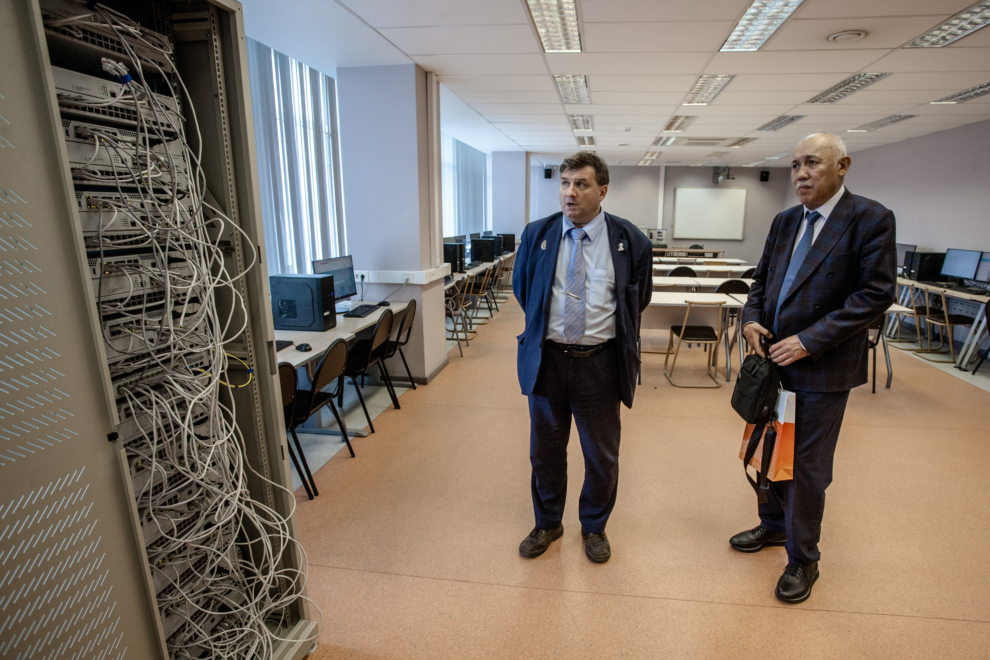 В ходе экскурсии по университету Бактыкбек Каримов особое внимание уделил лабораторному оборудованию, на котором студенты обучаются и исследуют все направления телекоммуникаций. Он отметил, что в Институте электроники и телекоммуникаций Киргизского государственного технического университета присутствуют также и лабораторные стенды «Бонча».