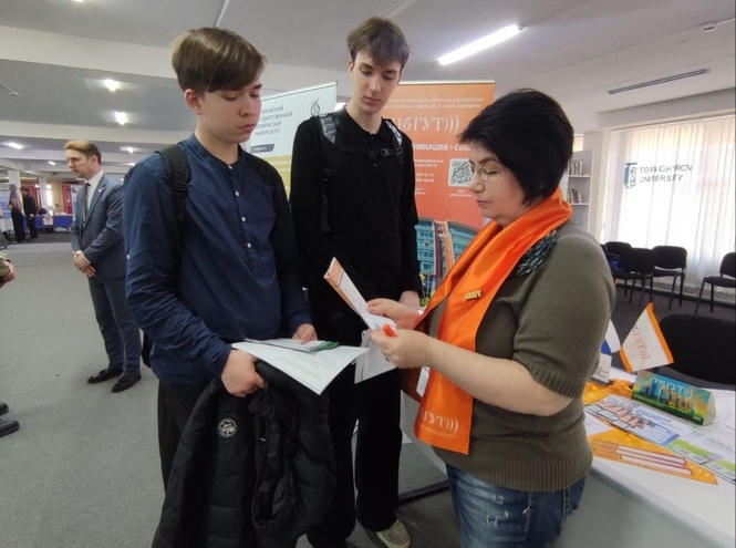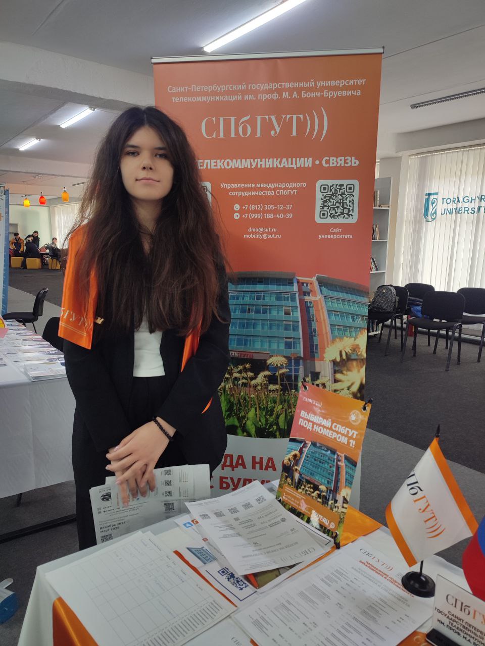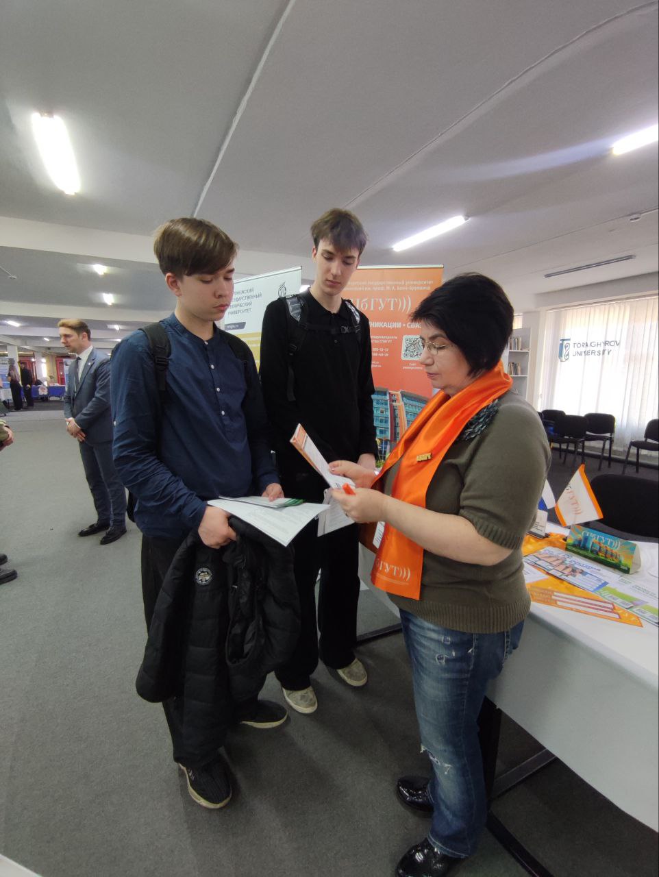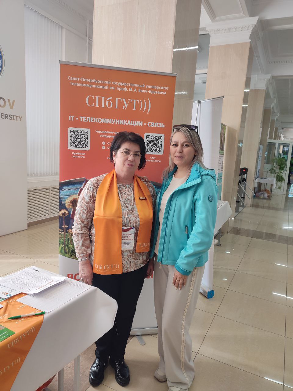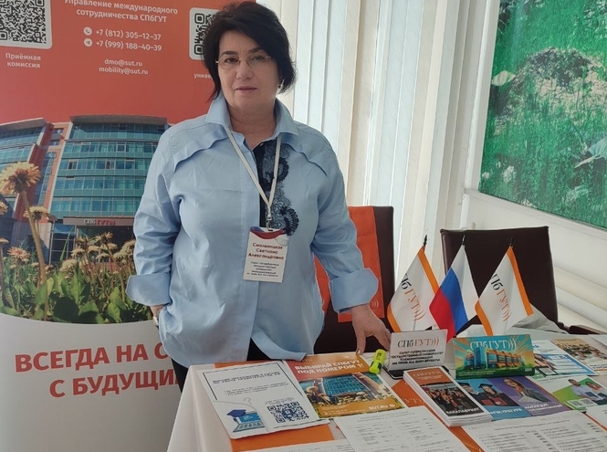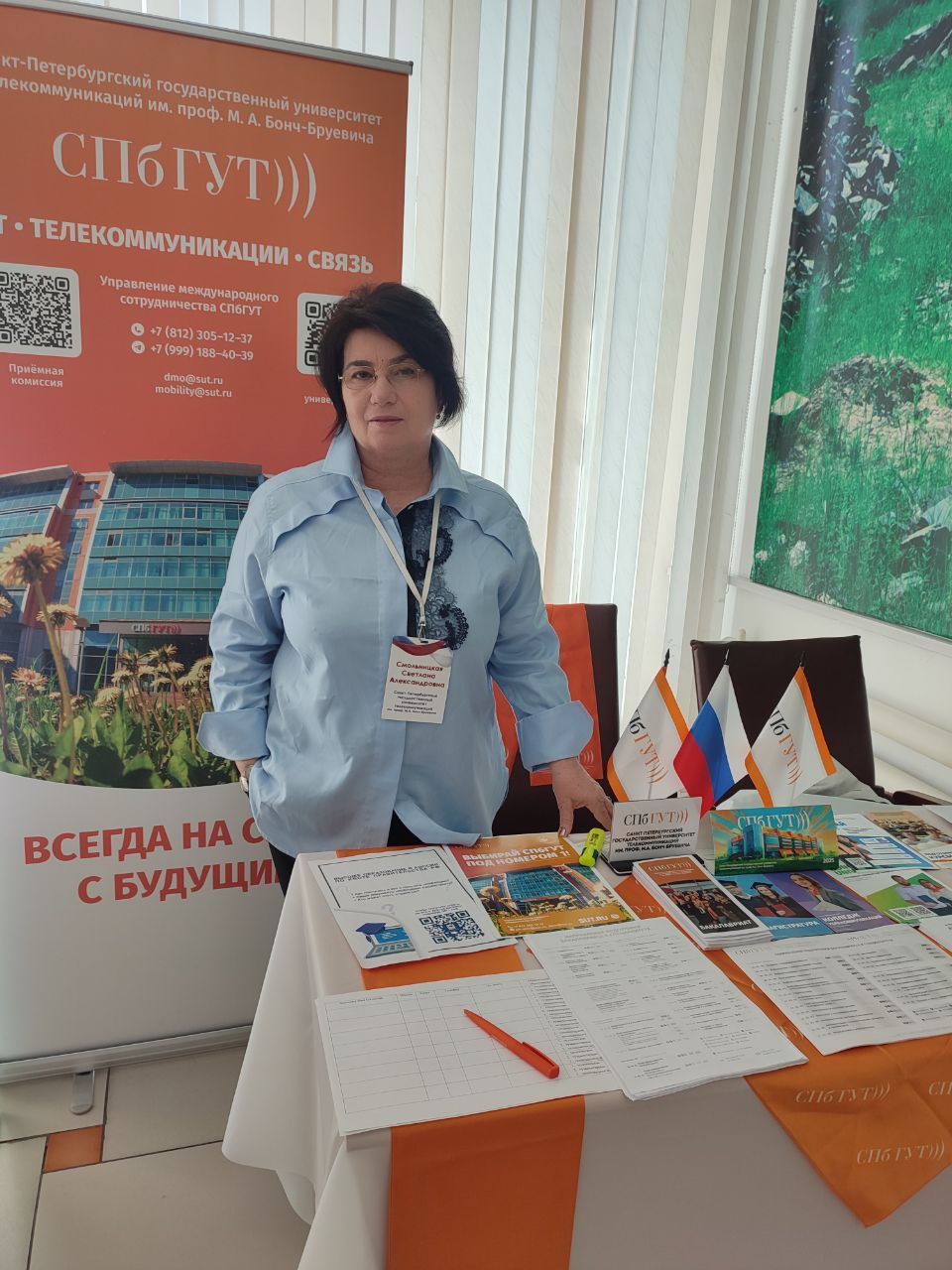 Санкт-Петербургский университет телекоммуникаций на выставках представила официальный представитель вуза Светлана Смольницкая. Она проводила консультации по вопросам обучения в СПбГУТ, отвечала на вопросы абитуриентов и их родителей, представляла возможности вуза как флагманского вуза Минцифры России.