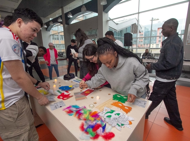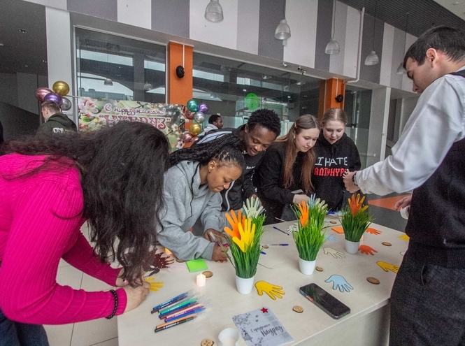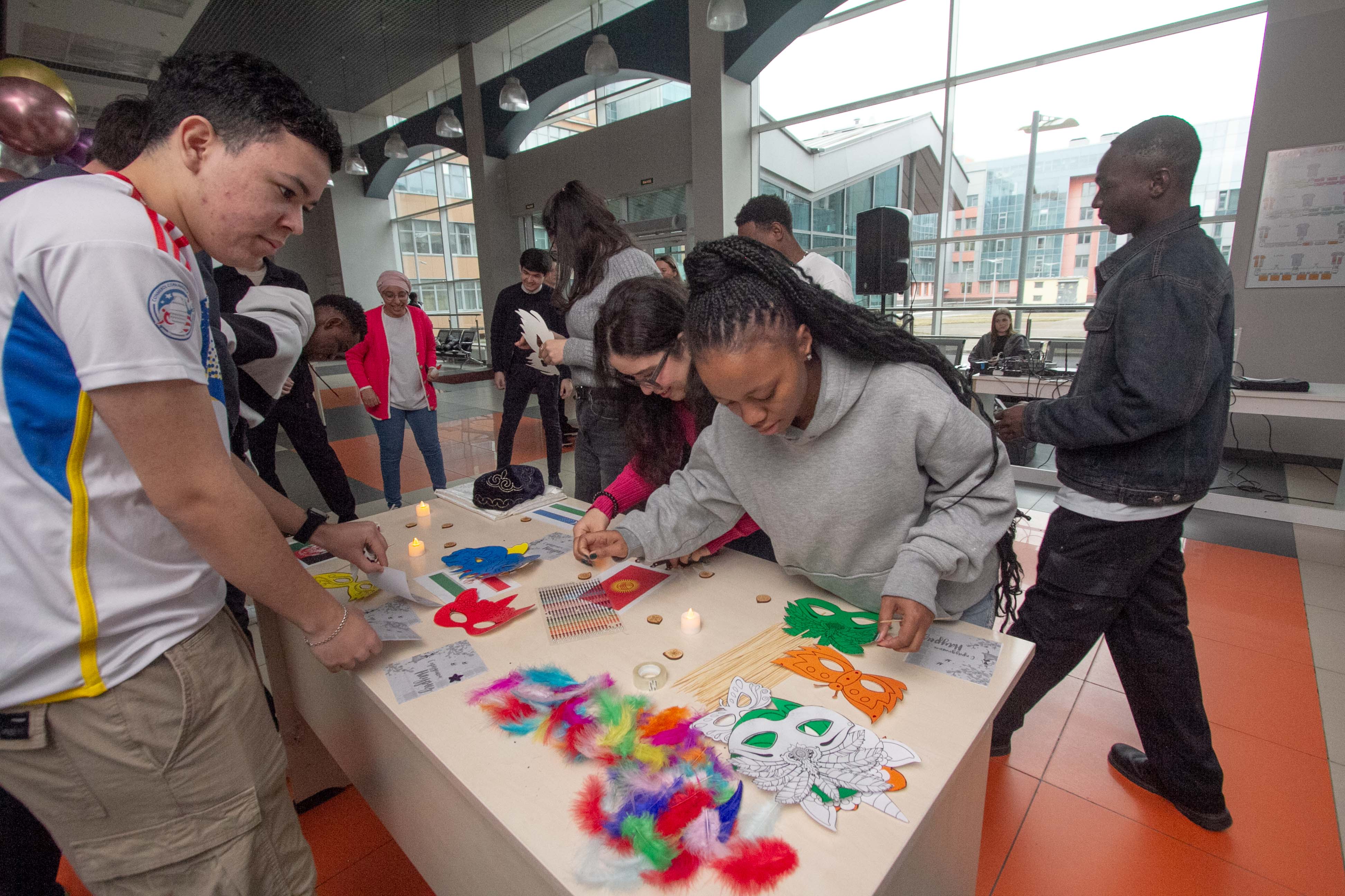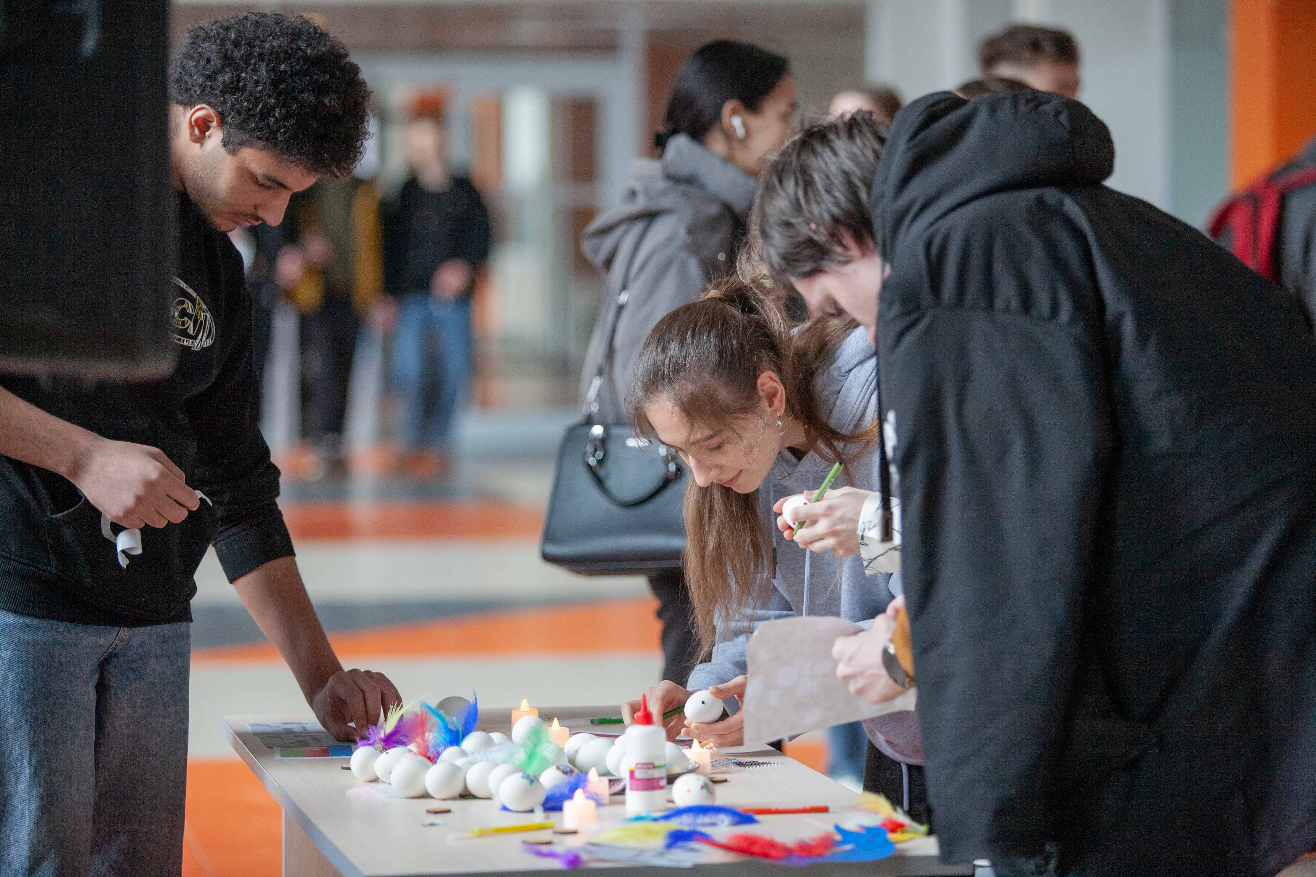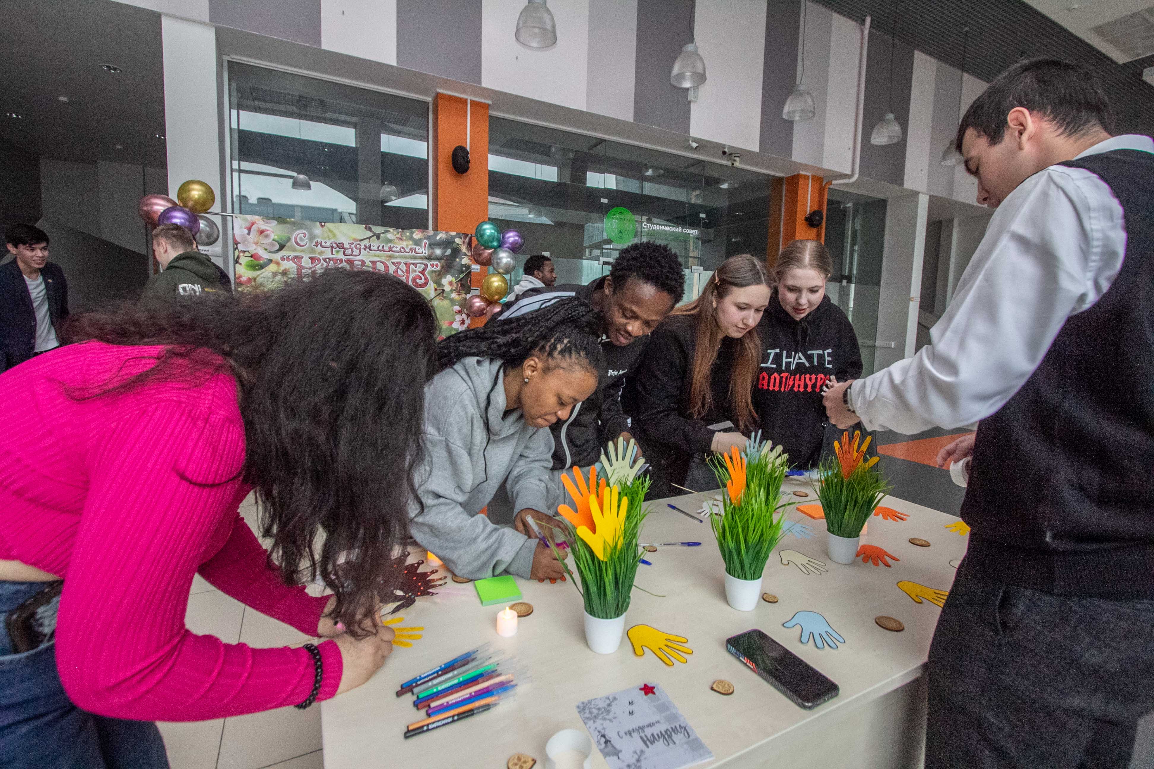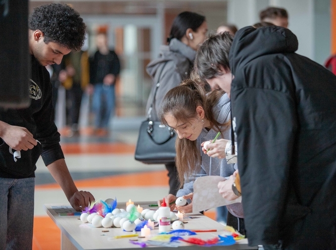 Прохождение каждой станции — всего их было пять — погружало гостей праздника в колорит разных стран. Ребята создали карнавальные маски, услышали, как звучат национальные музыкальные инструменты и попробовали без помощи рук надеть тюбетейку. Волю фантазии студенты дали на станции «Азербайджан». Там они украсили яйца, как это делают в восточных странах.