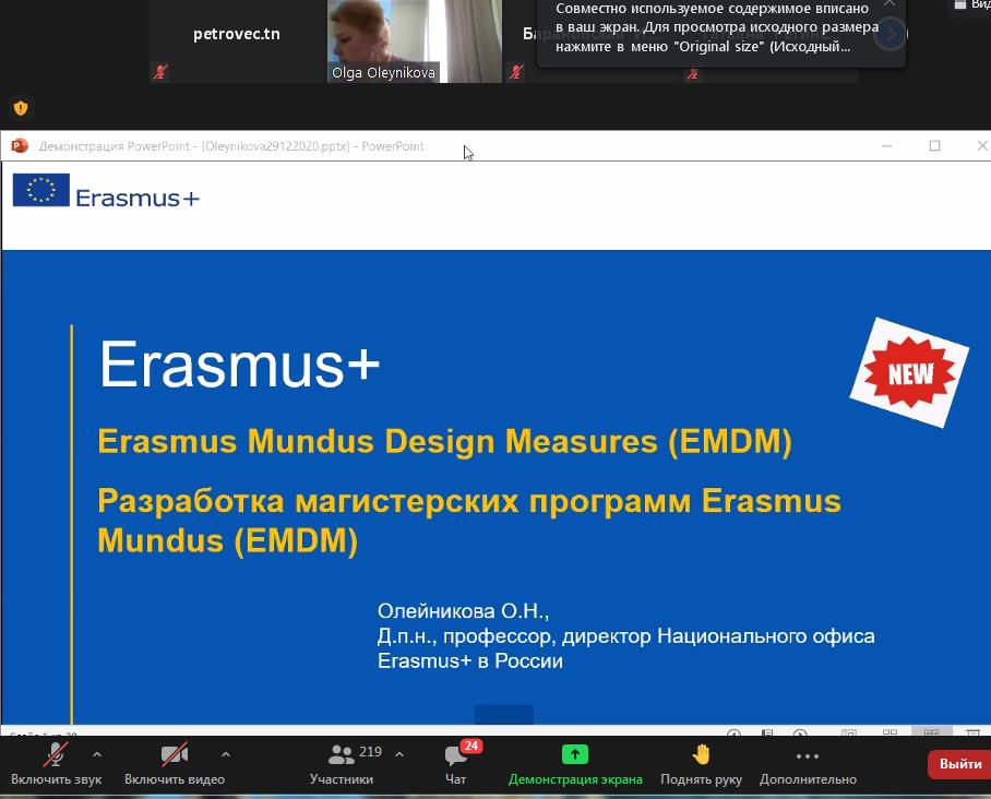 Во встрече приняли участие более 300 представителей университетов России. Коллеги из национального офиса Erasmus+ рассказали об особенностях конкурсов Erasmus Mundus Joint Masters, Erasmus Mundus Design Measures и Jean Monnet. Официально конкурсы будут опубликованы в начале 2021 г. на сайте.