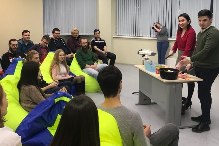 Главной кулинарной традицией практически каждой российской семьи поделились начальник отдела международного сотрудничества Ирина Ильдаровна Каримова и президент совета иностранных студентов Бадриддин Шахабов, проведя мастер-класс по приготовлению салата «Оливье». Также студенты по обмену познакомились с тематическими мультфильмами и фильмом «Ирония судьбы, или с легким паром!», посмотрели запись новогоднего обращения президента, загадали желания под бой курантов, обменялись поздравлениями и подарками. Ребята, в свою очередь, рассказали о том, как отмечают Рождество и Новый Год в Швеции и Франции.