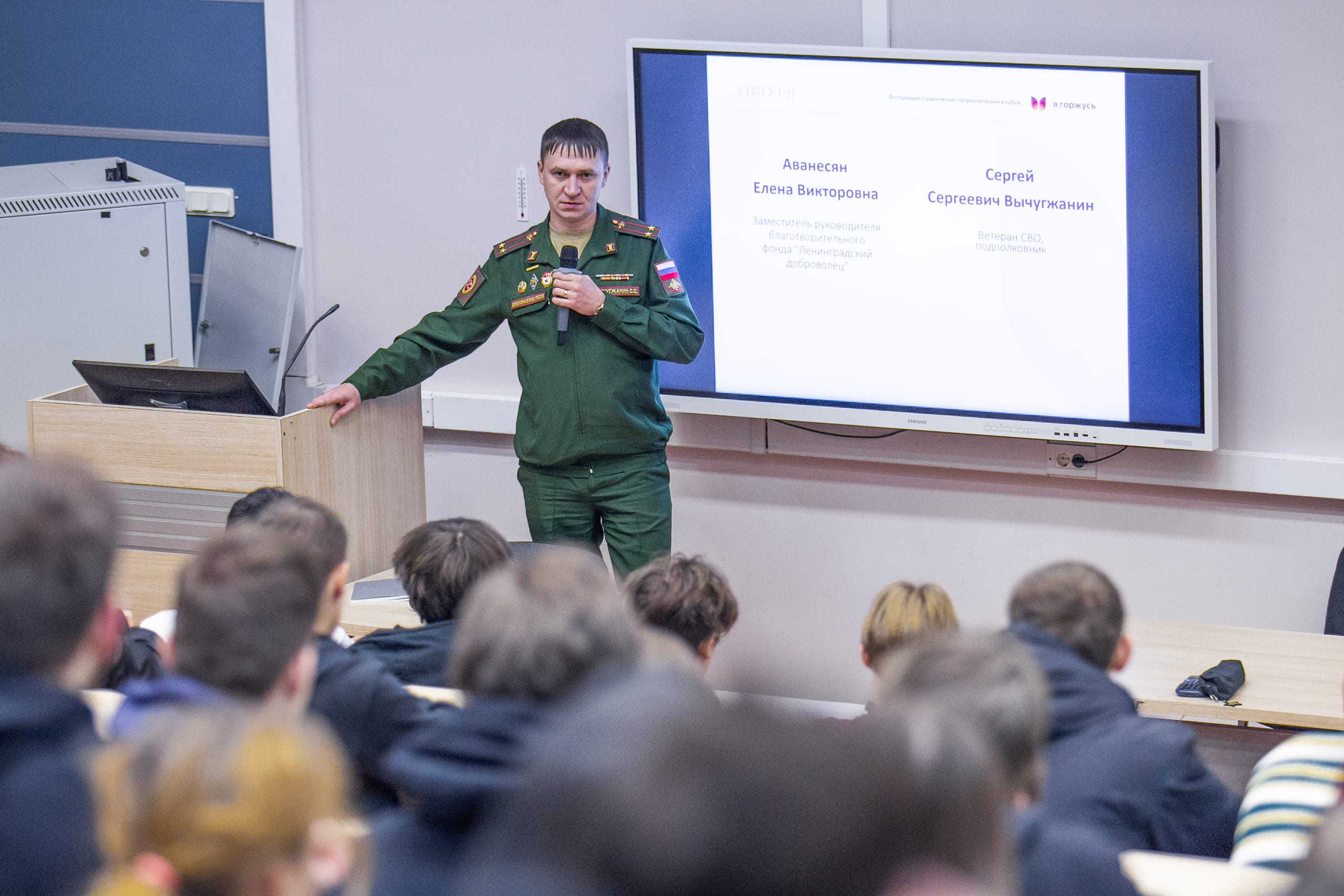 В рамках федерального проекта «Я горжусь. Герои» в Санкт-Петербургском университете телекоммуникаций прошла встреча с Еленой Аванесян, заместителем директора благотворительного фонда «Ленинградский доброволец», и подполковником связистом Сергеем Вычугжаниным, ветераном специальной военной операции.