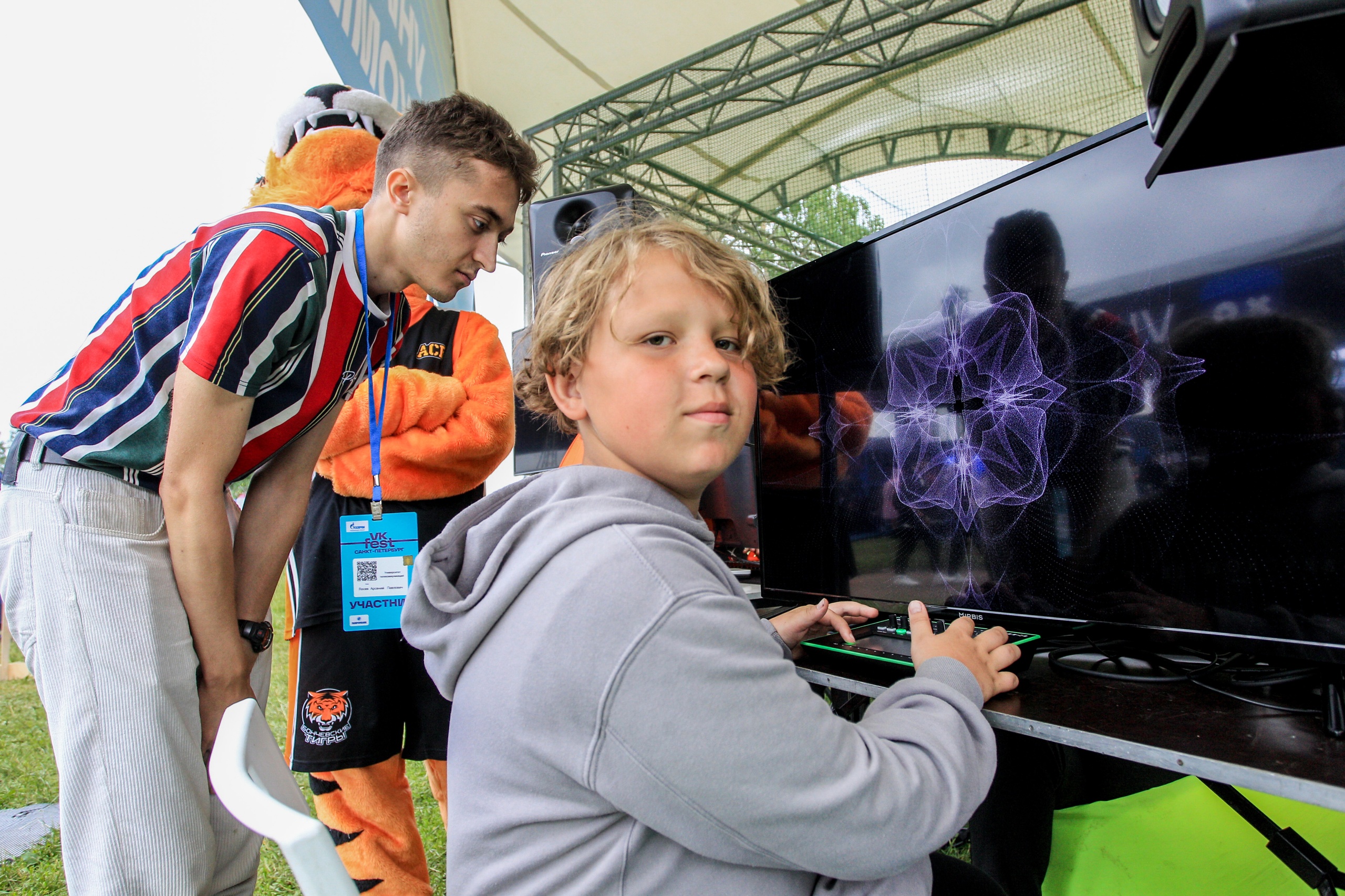 На специально оборудованной площадке посетители погружались в фиджитал-спорт: учились управлять дронами и запускали их по воздушной трассе. Можно было попробовать себя в роли диджея на музыкальном визуализаторе, поучаствовать в создании контента с помощью виртуальной студии видеопродакшна, дать интервью журналистам Медиацентра.