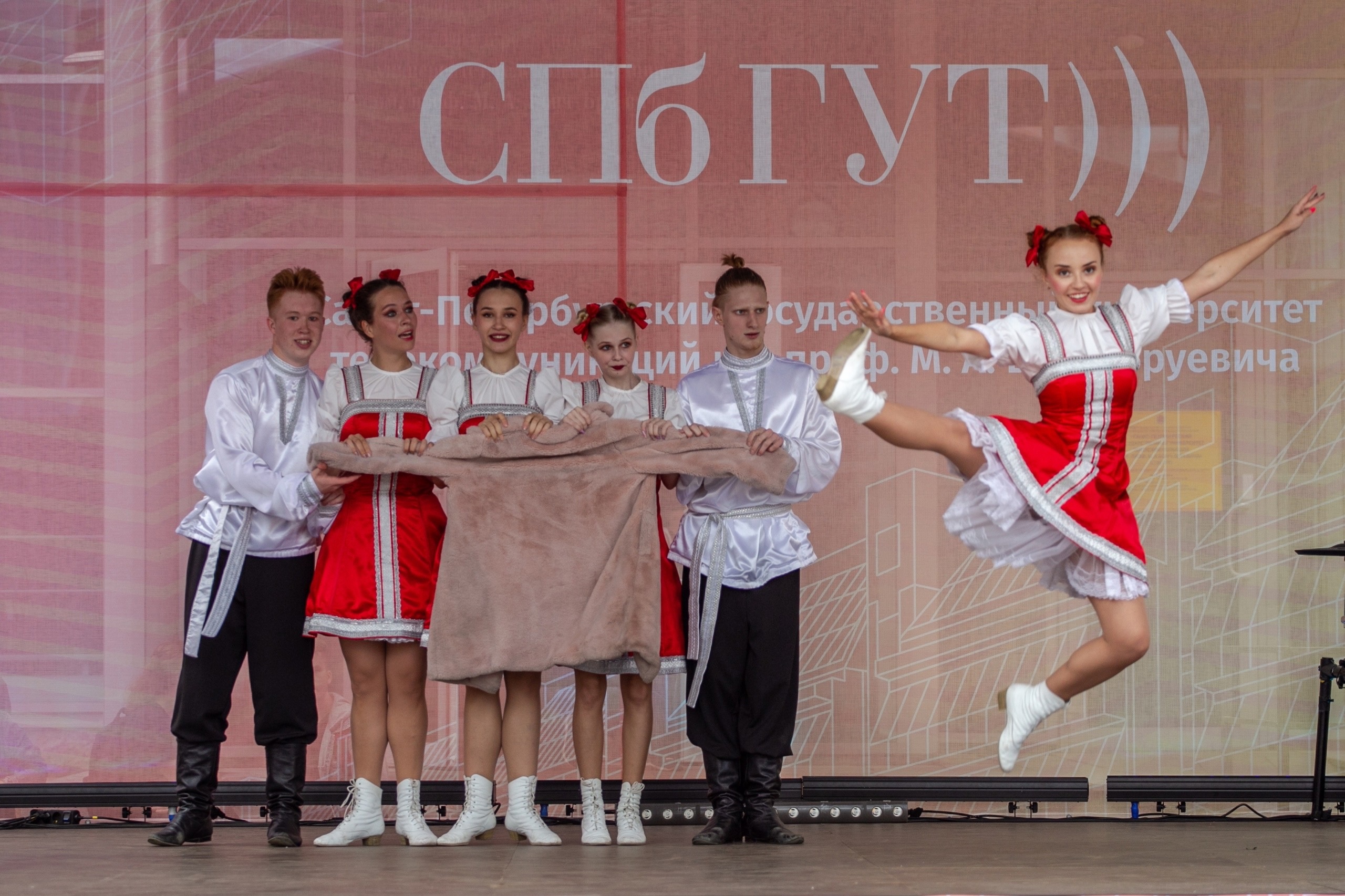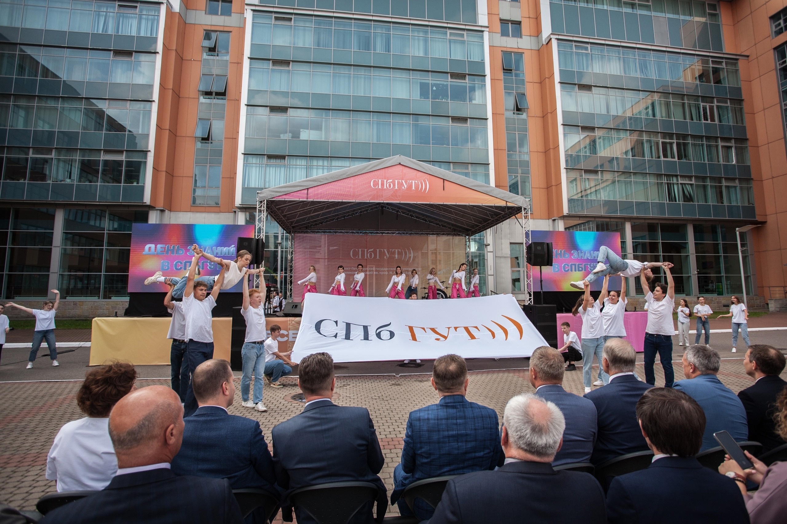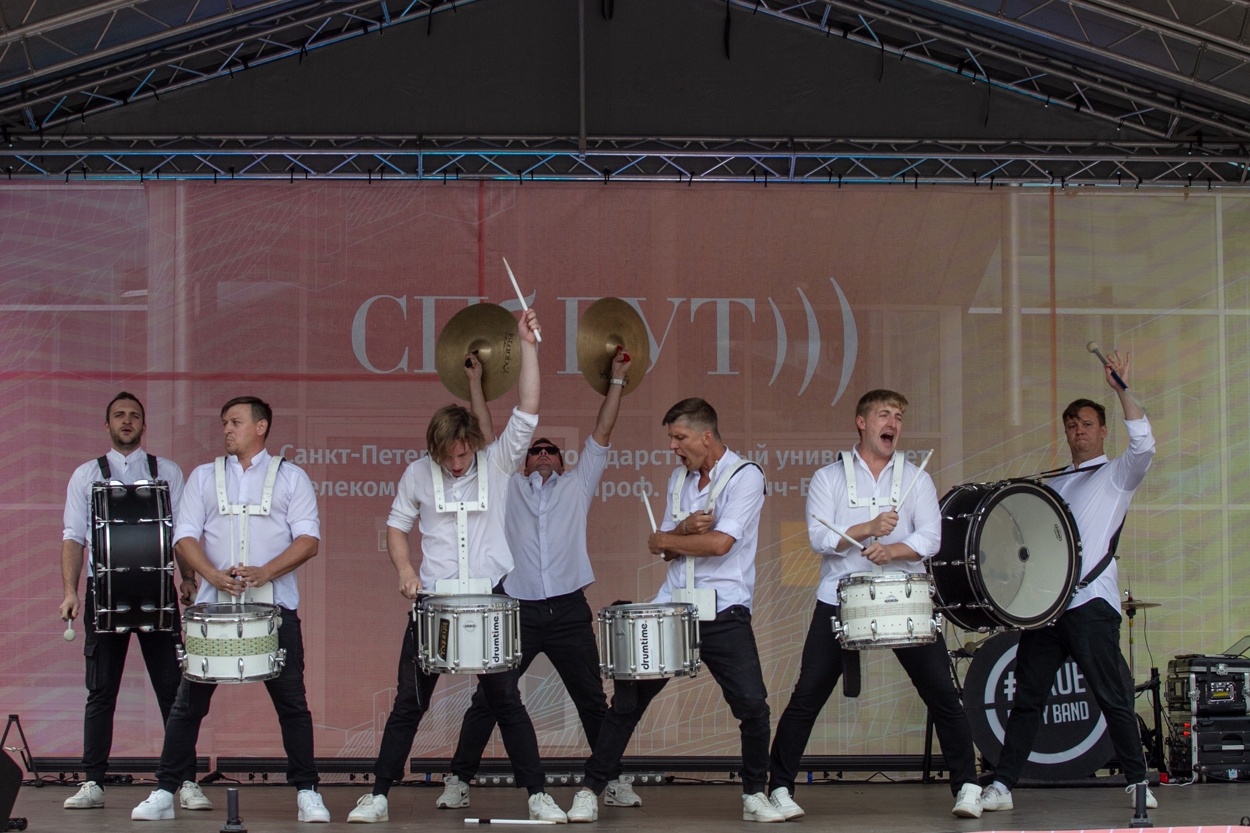 Праздничный концерт стартовал с танцевального номера «Нас не догонят» и барабанного шоу DRUMTIME, после чего прозвучали гимн России и гимн СПбГУТ.