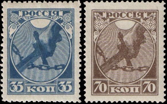 Марка была двух номиналов: 35 копеек синего цвета и 70 копеек тёмно‑коричневого цвета. На ней изобразили руку с мечом, разрубающую цепь, на фоне восходящего солнца. Сверху стояла надпись «Россия», снизу — «Почта» и указание номинала. Общая идея изображения символизировала начало новой эпохи. Образ разрубаемой цепи воплощал освобождение от «оков старого мира», восходящее солнце символизировало рассвет новой эры, а сама композиция выстраивалась как чёткий визуальный лозунг революционных преобразований.