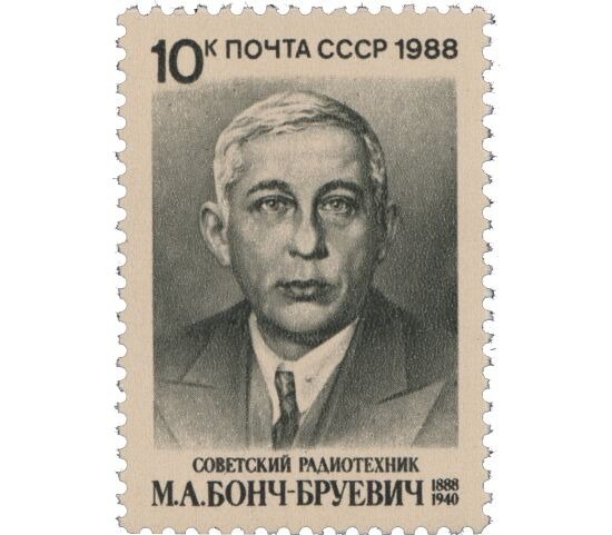 В феврале 1988 года почта Советского Союза выпустила в обращение марку, посвящённую столетию со дня рождения выдающегося радиотехника Михаила Александровича Бонч-Бруевича. Марка номиналом в 10 копеек, ставшая не только почтовым знаком, но и своеобразным памятником его научному наследию, была отпечатана достаточно большим тиражом — 2,6 млн экземпляров и поступила в обращение 21 февраля. Композиция построена вокруг портрета учёного, выполненного в монохромной гамме на чистом фоне. Портрет показывает Бонч-Бруевича в зрелые годы с сосредоточенным и спокойным выражением лица. Его имя указано под портретом и сопровождается обозначением «советский радиотехник» стандартным для советских марок шрифтом: «М.А. БОНЧ-БРУЕВИЧ». Дополняет оформление лишь скромный, но необходимый элемент в виде годов жизни «1888-1940».
