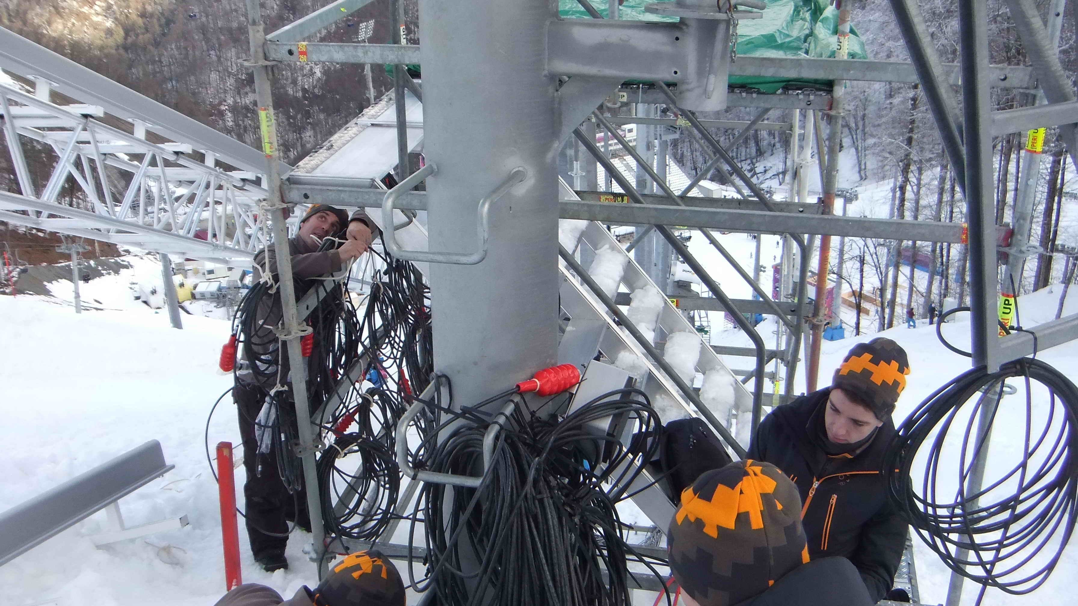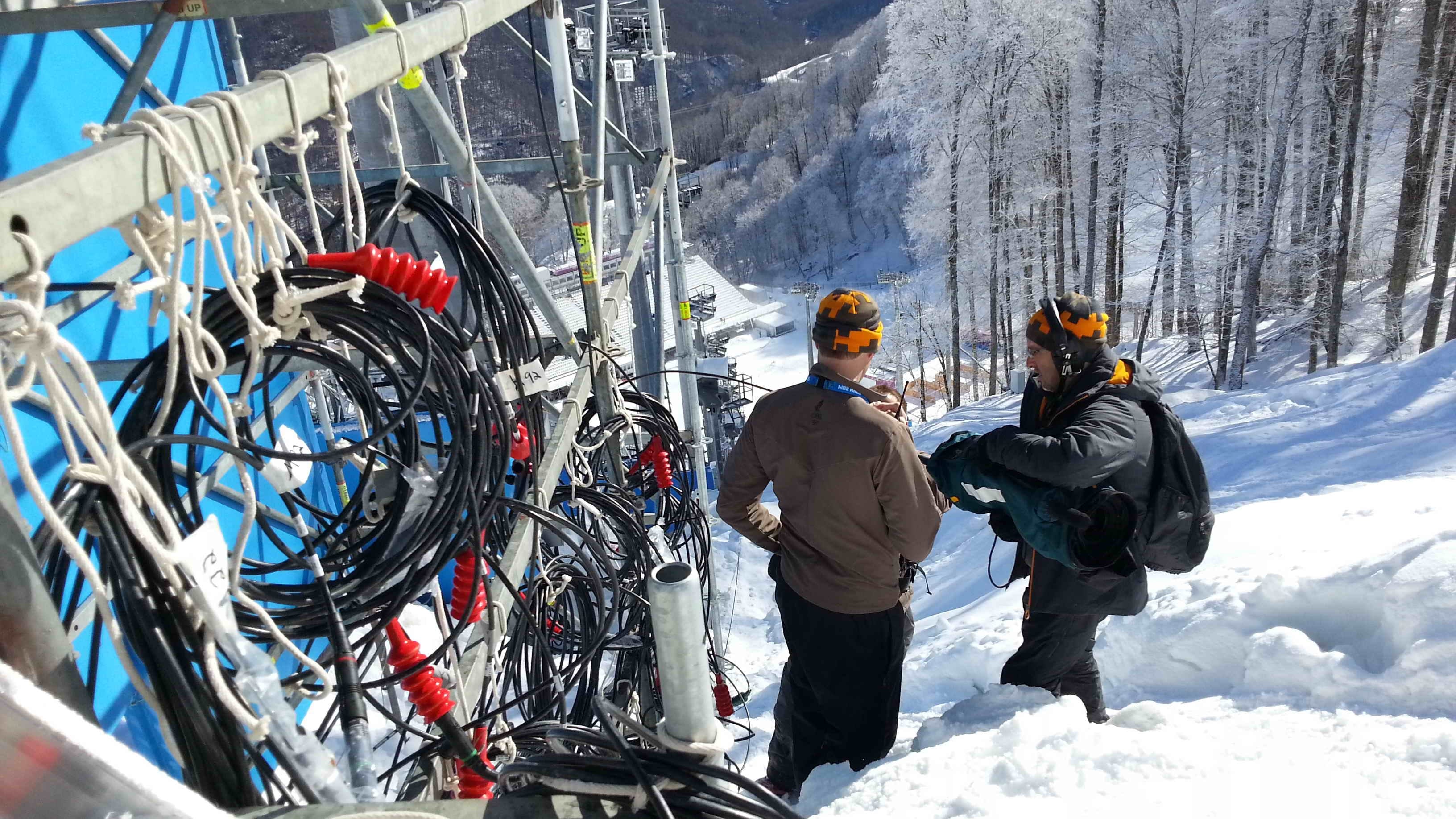 Разместили нас в только что построенных гостиницах по два-три человека в комнате. А на следующий день после приезда мы приступили к работе. Нам предстояло «протянуть» по горным склонам несметное количество кабелей, установить микрофоны и видеокамеры на платформы, подготовить комментаторские позиции, создать зоны для прессы (микст-зоны), обеспечить комфортную работу самих вещателей.