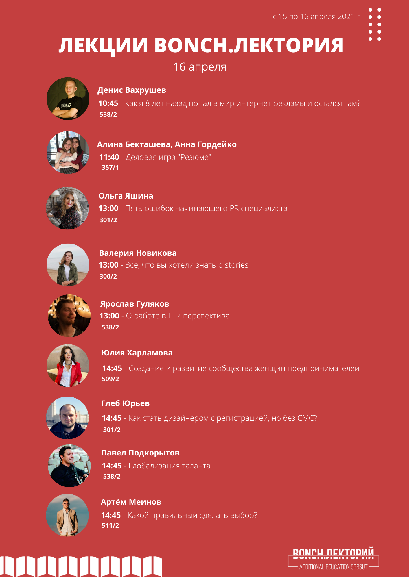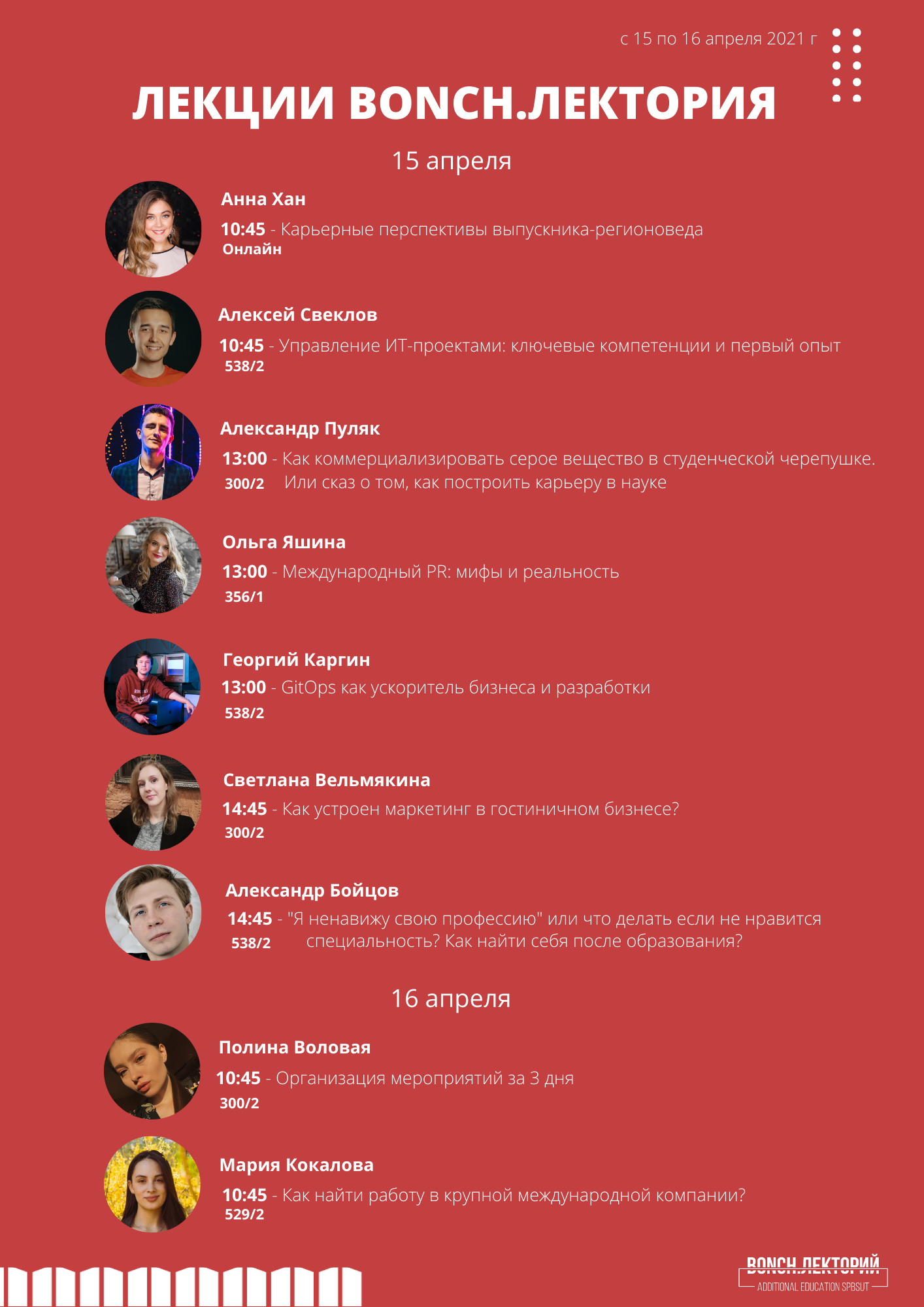 15 апреля на факультете СЦТ стартовало ежегодное мероприятие «Бонч Лекторий», в рамках которого проводится серия мастер-классов от практикующих специалистов в сфере рекламы, связей с общественностью, зарубежного регионоведения и IT.