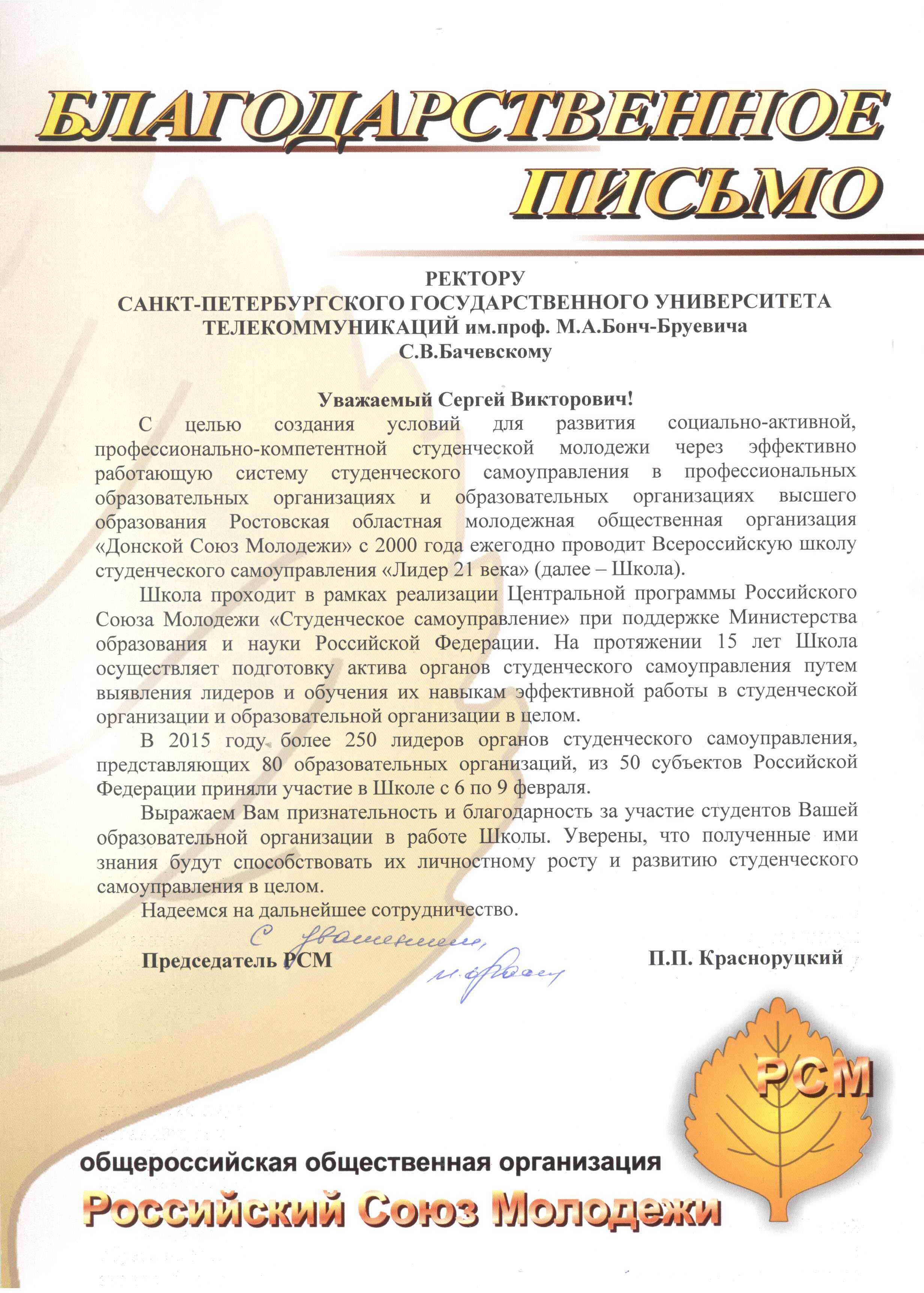 По итогам участия наших студентов в школе "Лидер 21 века" общероссийская общественная организация "Российский Союз Молодежи" направила в адрес университета благодарственное письмо.