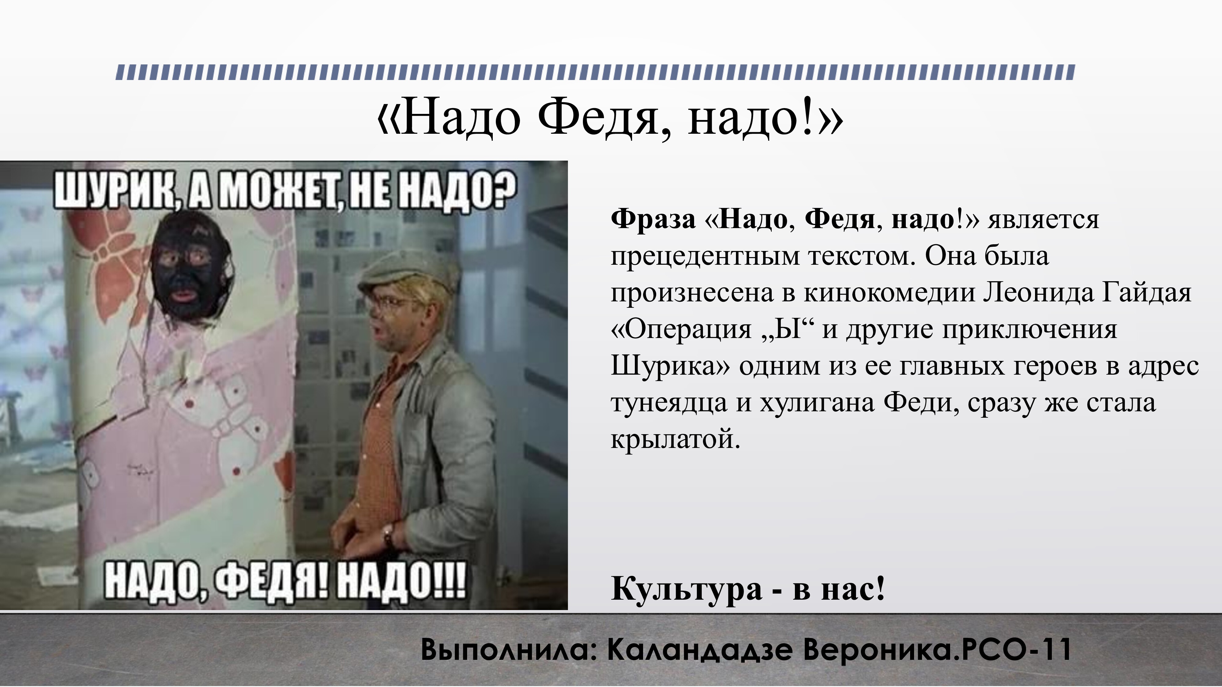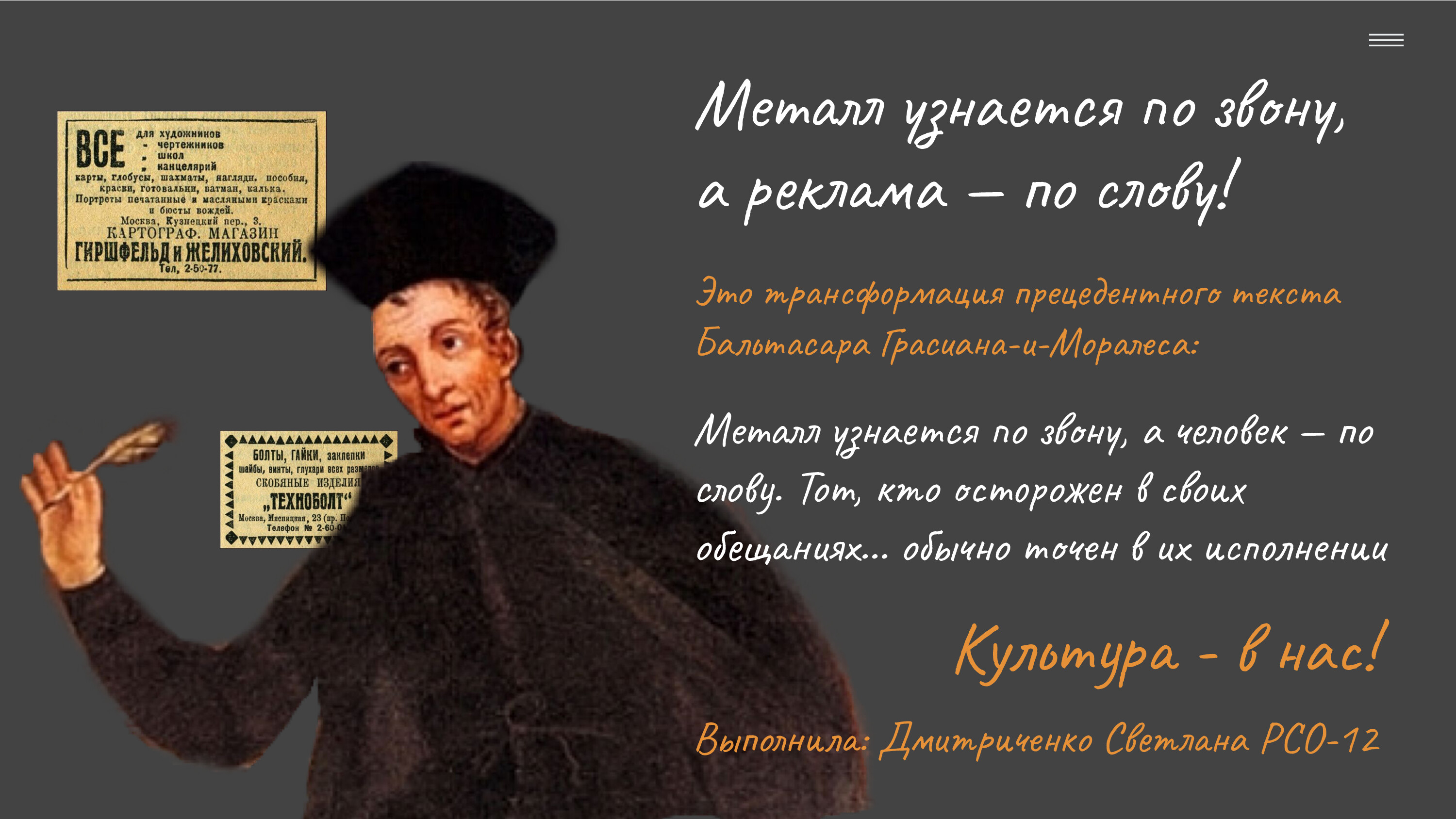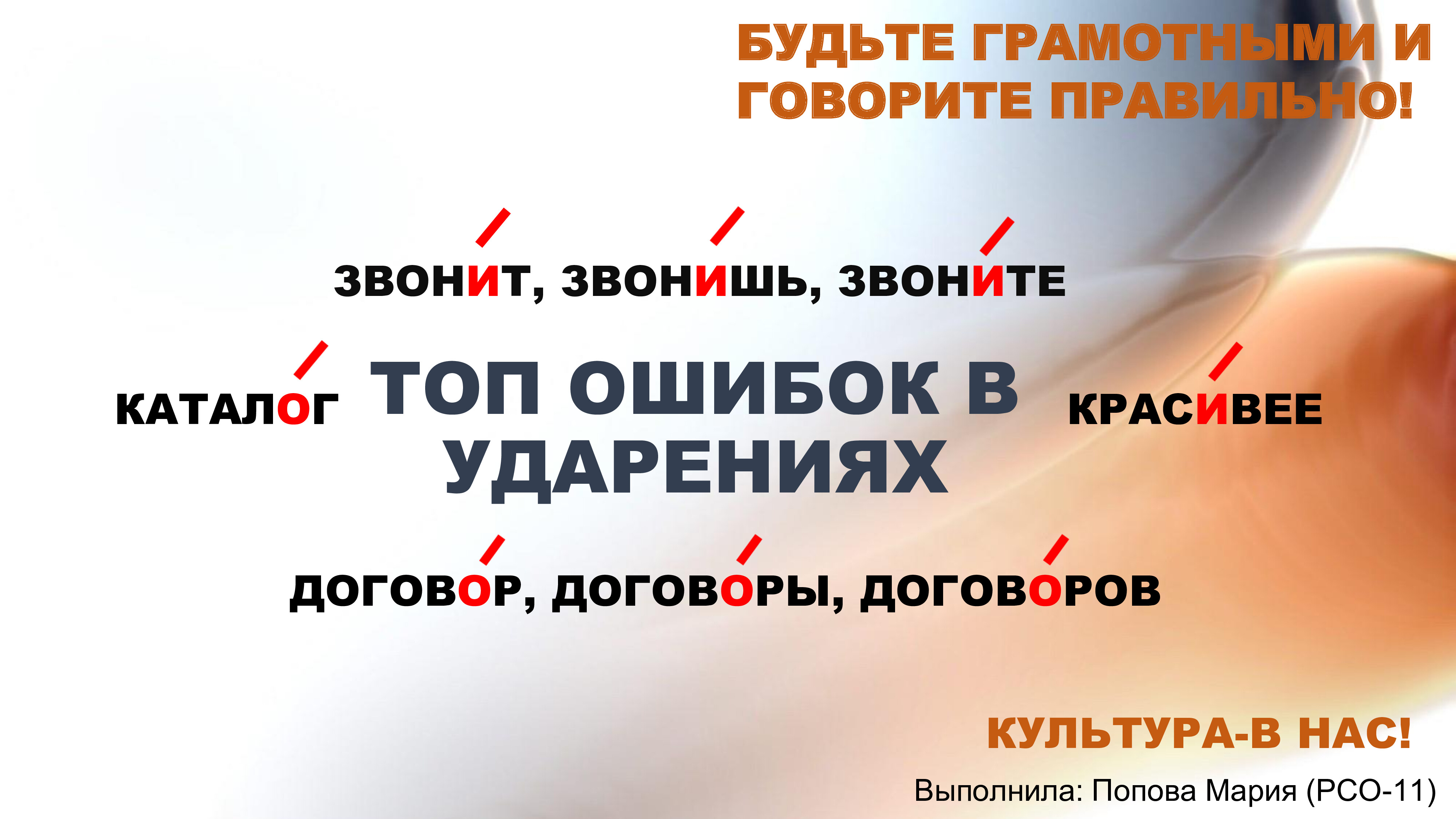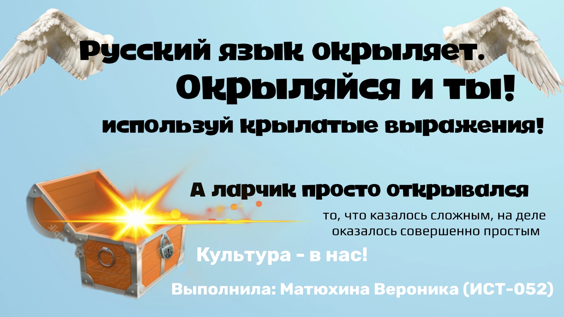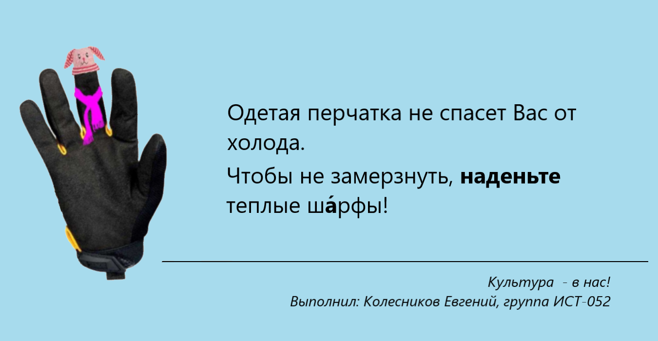 В преддверии наступления 2022 года, объявленного в России Годом народного искусства и нематериального культурного наследия, кафедра иностранных и русского языков предложила студентам СПбГУТ принять участие в разработке собственного творческого проекта «Культура – в нас». Проектная работа выполнялась в рамках изучения дисциплины «Русский язык и культура речи».