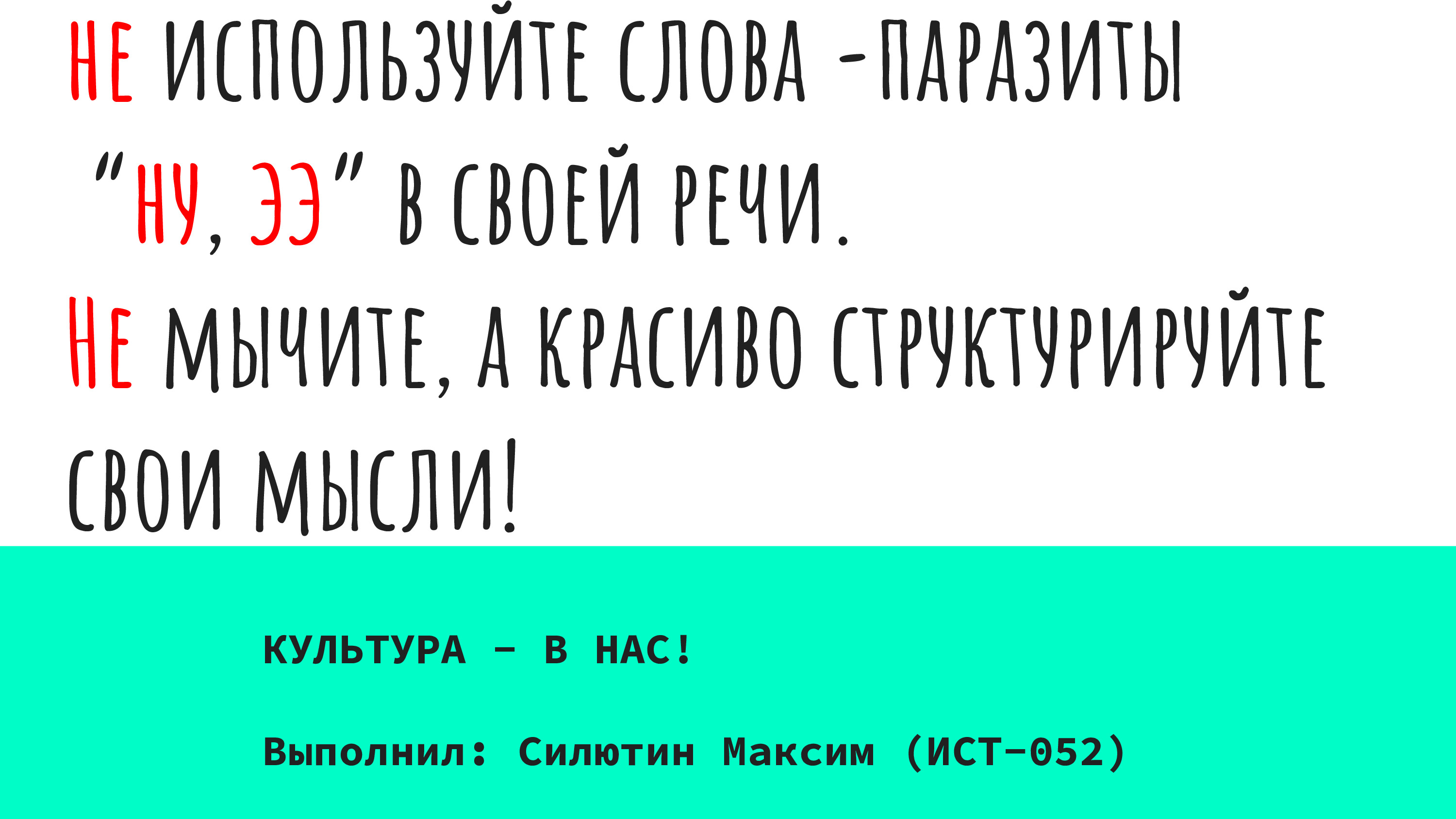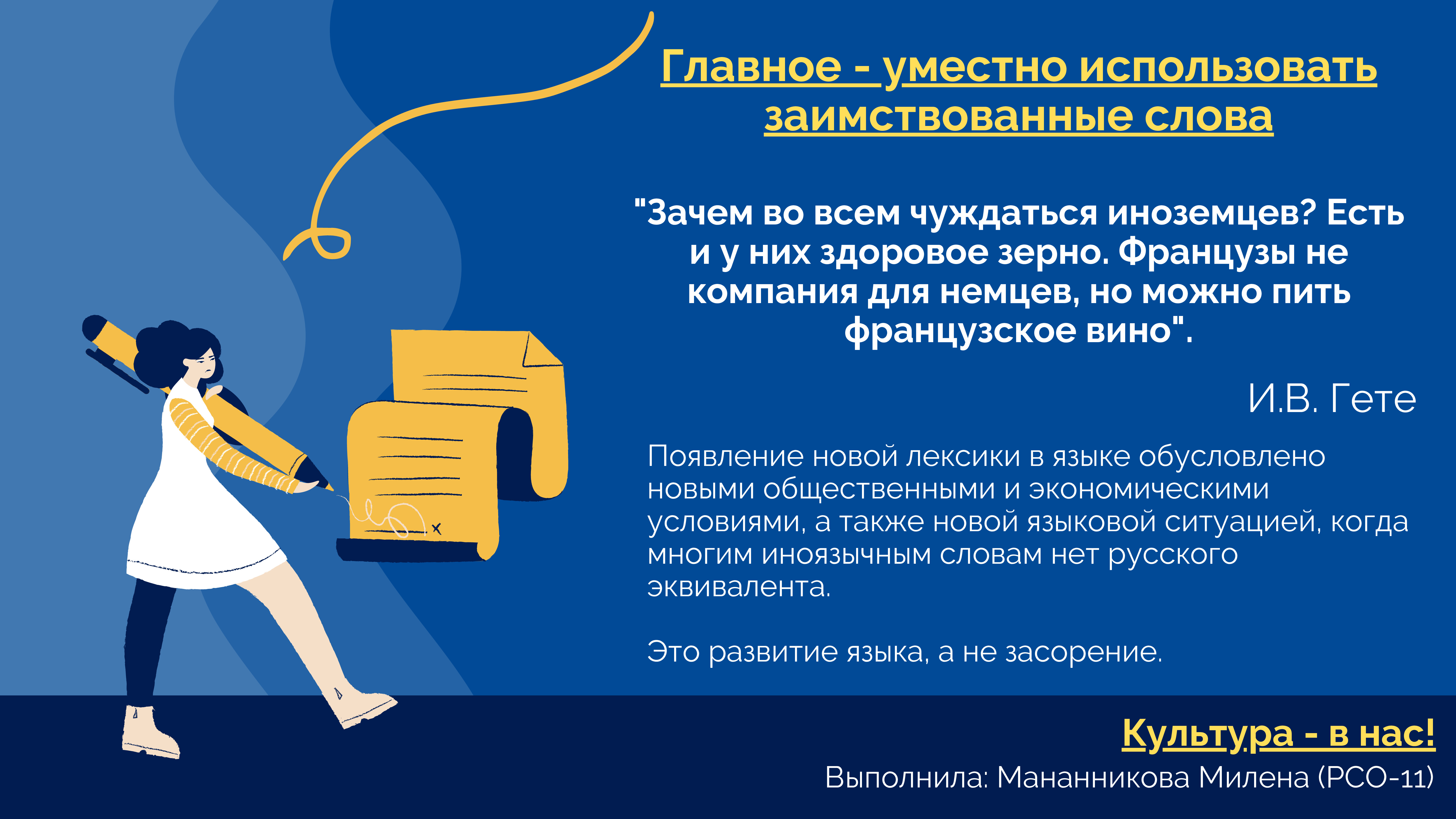 «Не нужно думать о том, что когда-нибудь наши дети и внуки научатся красиво мыслить, говорить и писать. Культура – это здесь и сейчас, а грамотное поколение – это мы», – отметила преподаватель.