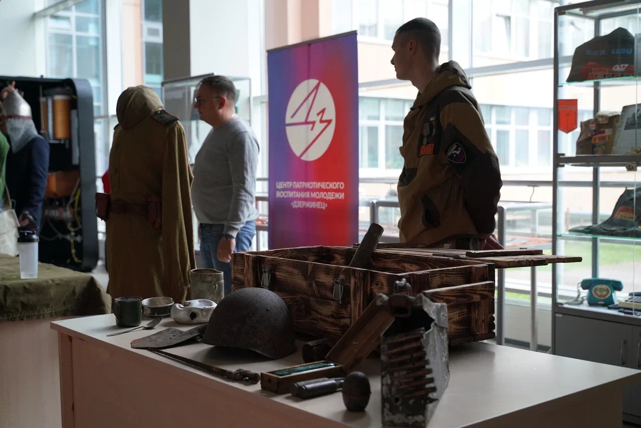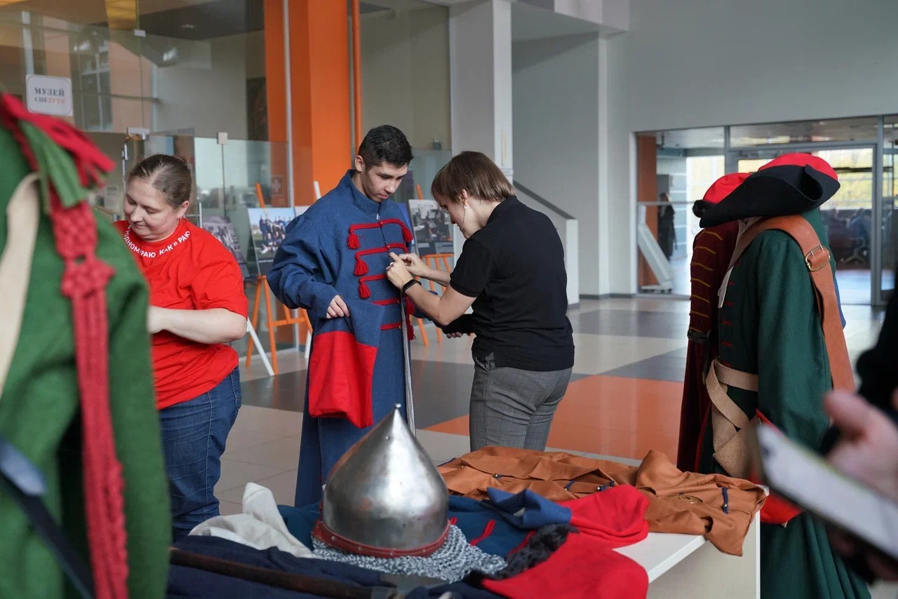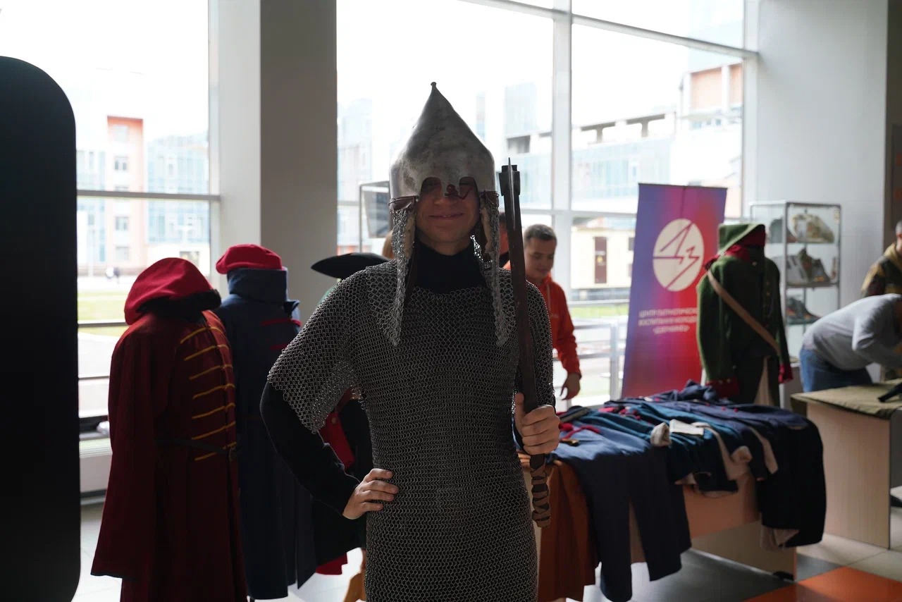 В интерактивном формате в холле 1 этажа ребята познакомились с находками, обнаруженными в ходе поисковых работ; примерили исторические костюмы и сфотографировались; разобрали и собрали автомат Калашникова.