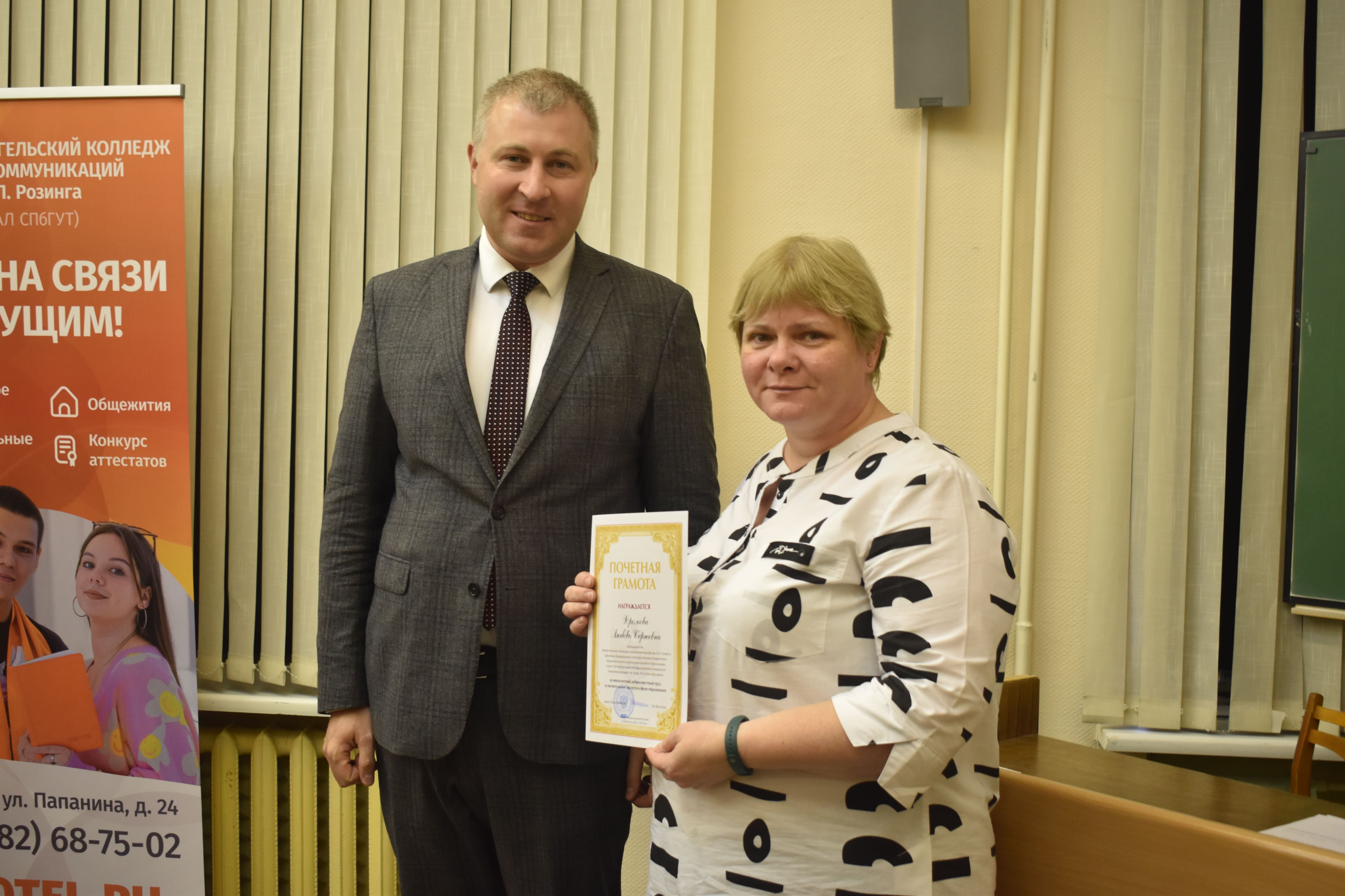 Ректор СПбГУТ Руслан Киричёк встретился с коллективом АКТ во главе с директором Антоном Боярко. Ведущим сотрудникам колледжа были вручены ведомственные награды.