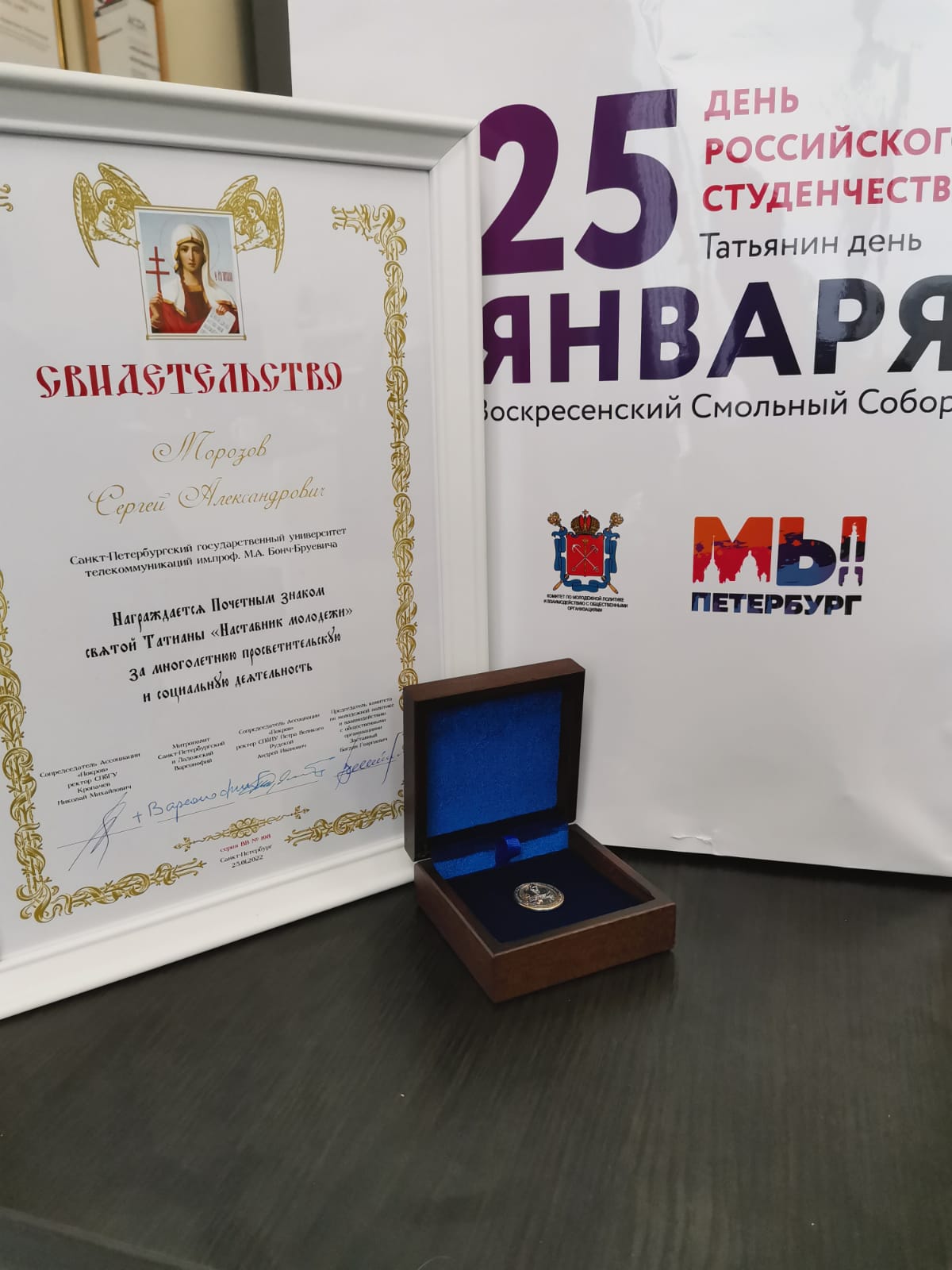 В этом году Знак святой Татианы получили 40 петербуржцев. Среди лауреатов – студенты и преподаватели вузов, руководители молодёжных организаций. Почетной наградой отмечена деятельность начальника отдела по воспитательной работе СПбГУТ Сергея Морозова.