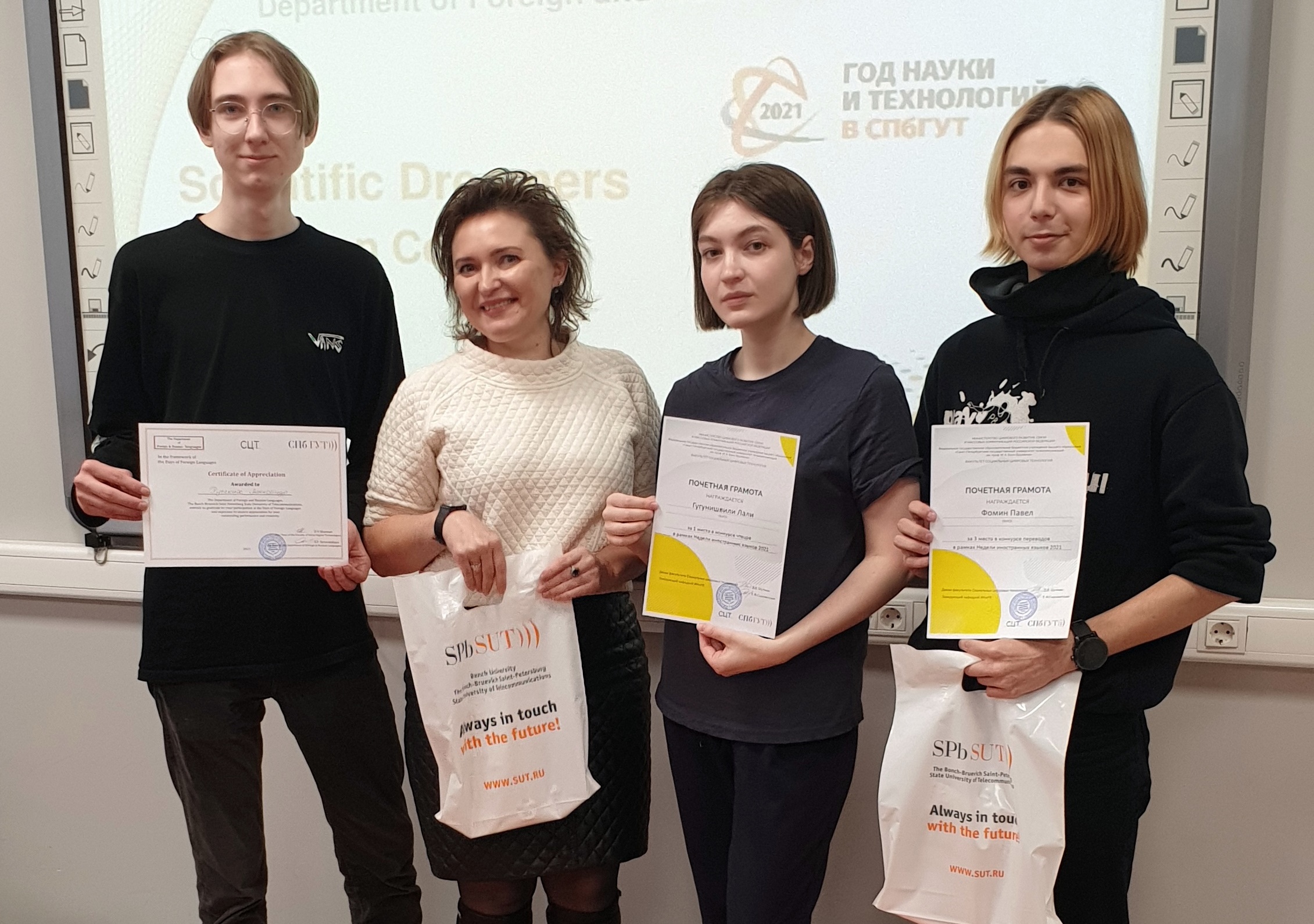 С 27 марта по 20 апреля кафедра иностранных и русского языков проводила мероприятия для студентов 1 курса факультетов ИКСС, ИСиТ, РТС, ЦЭУБИ и ФФП СПбГУТ в рамках Недели иностранных языков. 28 апреля состоялось награждение победителей конкурсов Недели.