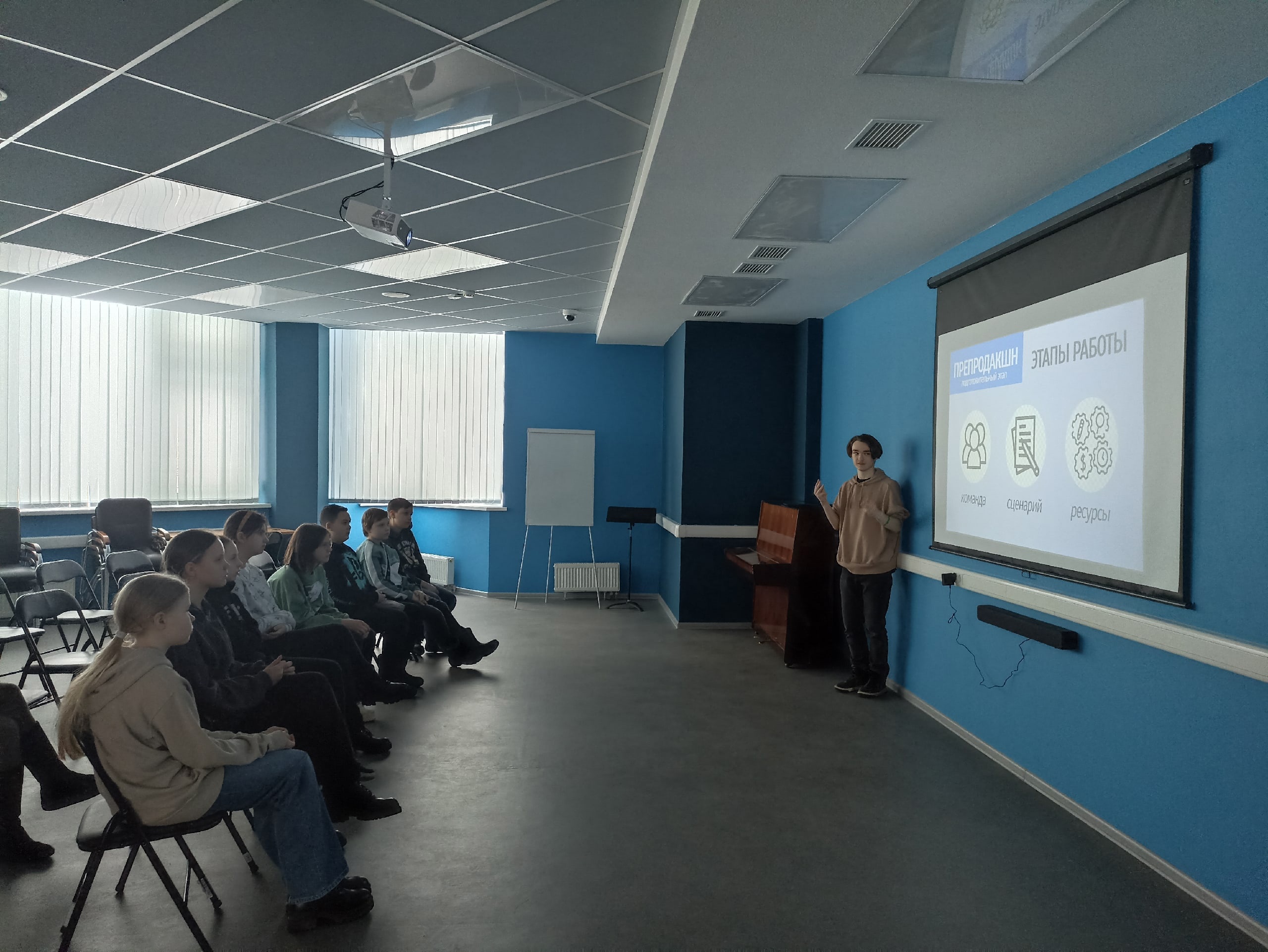 Председатель студенческого совета факультета социальных цифровых технологий Арсений Аксенов рассказал ребятам о секретах создания медиа-проектов – от продакшна до пост-продакшна. Руководитель отдела видеотехнологий Дарья Кузьмина провела экскурсию в «Медиацентр» и показала современное оборудование радио и телестудии.