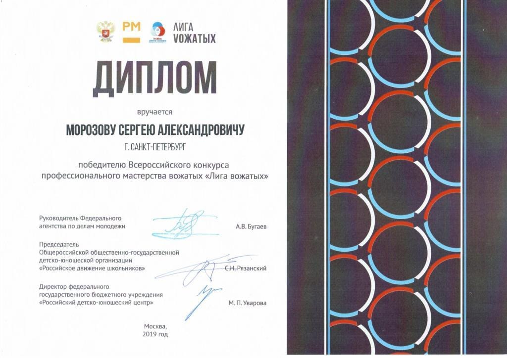 15 декабря в Москве подвели итоги Всероссийского конкурса педагогического мастерства «Лига вожатых». В число победителей вошли 6 петербуржцев, в том числе начальник студенческого культурно-досугового центра СПбГУТ Сергей Александрович Морозов.