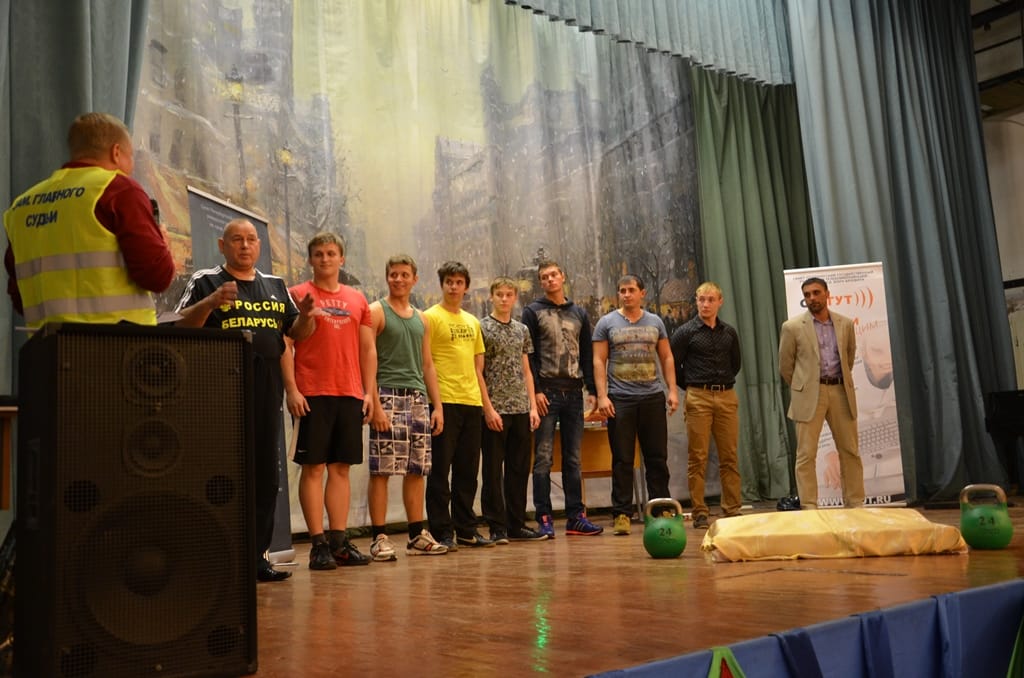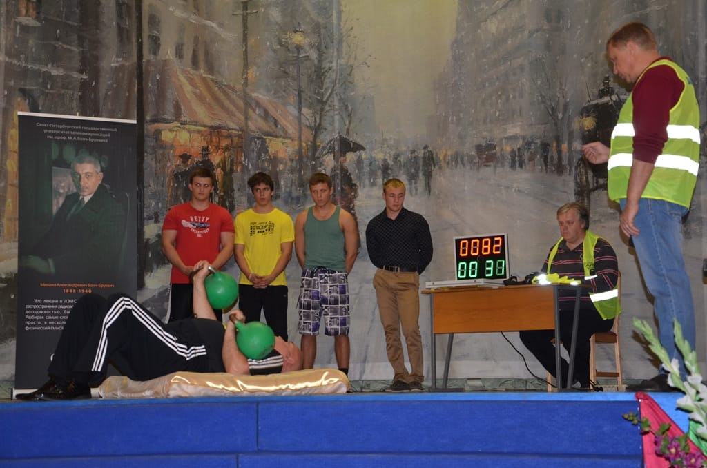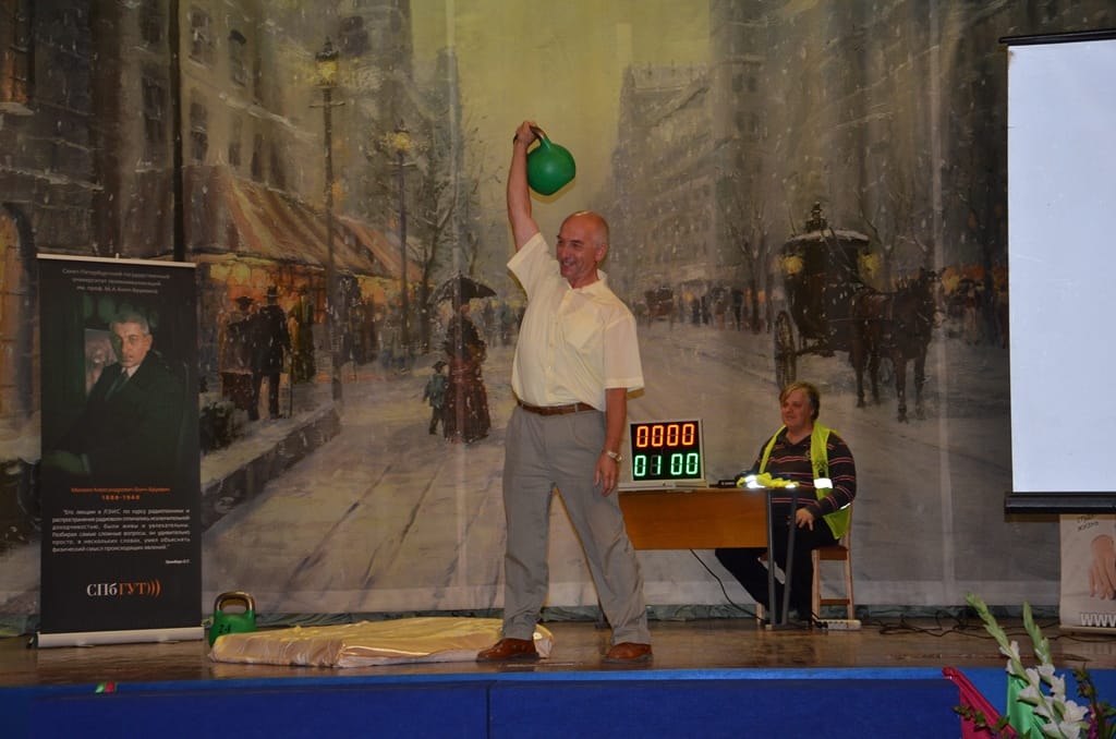 После просмотра фильма, демонстрирующего успехи и перспективы гиревого спорта в России, на сцену были приглашены спортсмены, уже добившиеся серьёзных результатов в этом виде спорта, а также студенты СПбГУТ, занимающиеся в секции по гиревому спорту кафедры физической культуры. Пока они пробовали свои силы в кратком состязании, к выступлению готовился Анатолий Ежов.