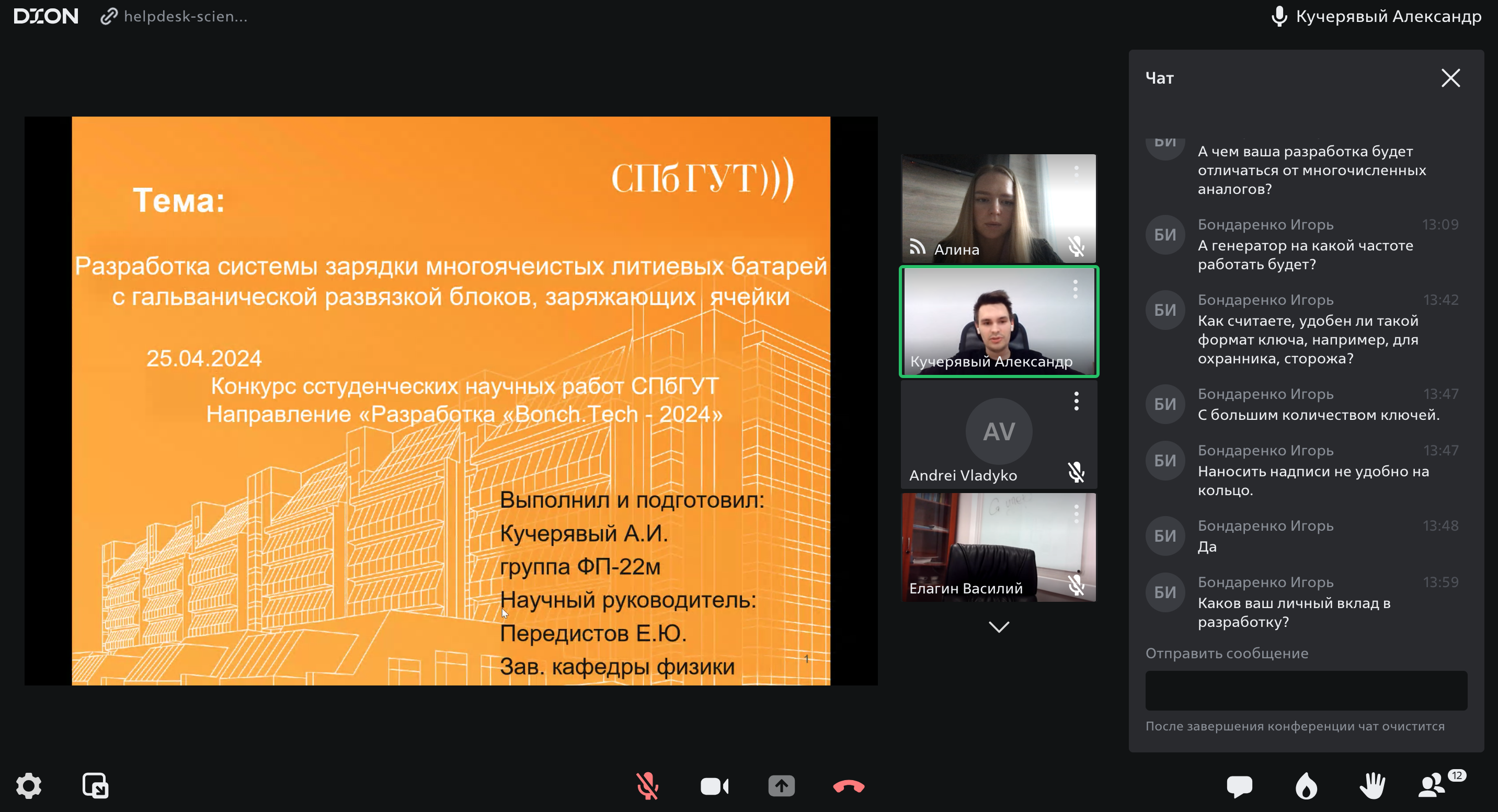 24 и 25 апреля в СПбГУТ в дистанционном формате состоялись заседания комиссии конкурса студенческих научных работ по направлению «Разработка "Bonch.Tech-2024"». Студенты зарегистрировали 24 проекта, 20 из которых по результатам оценивания прошли во второй этап.