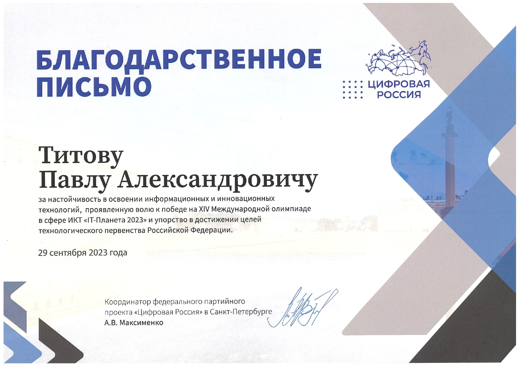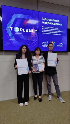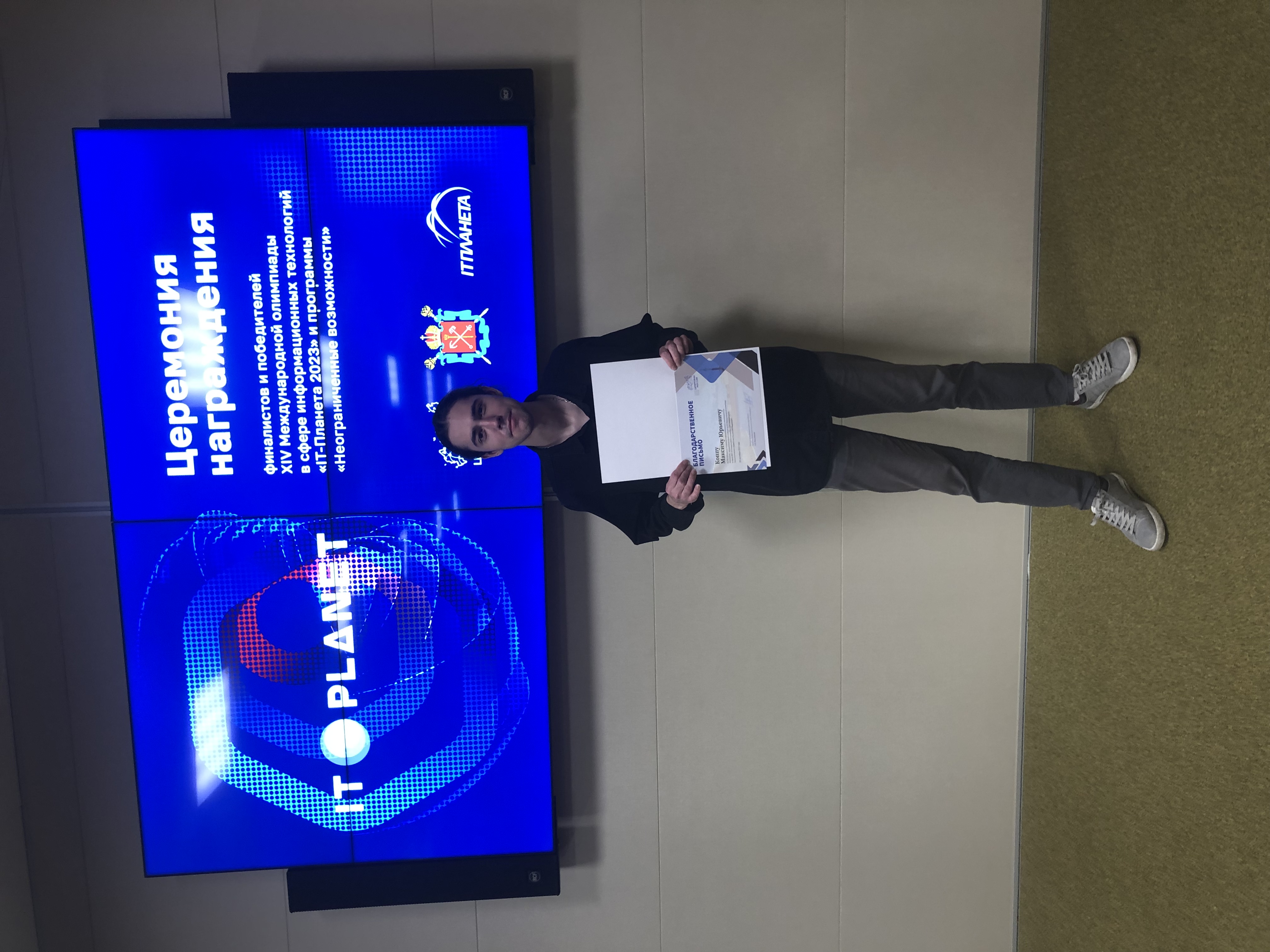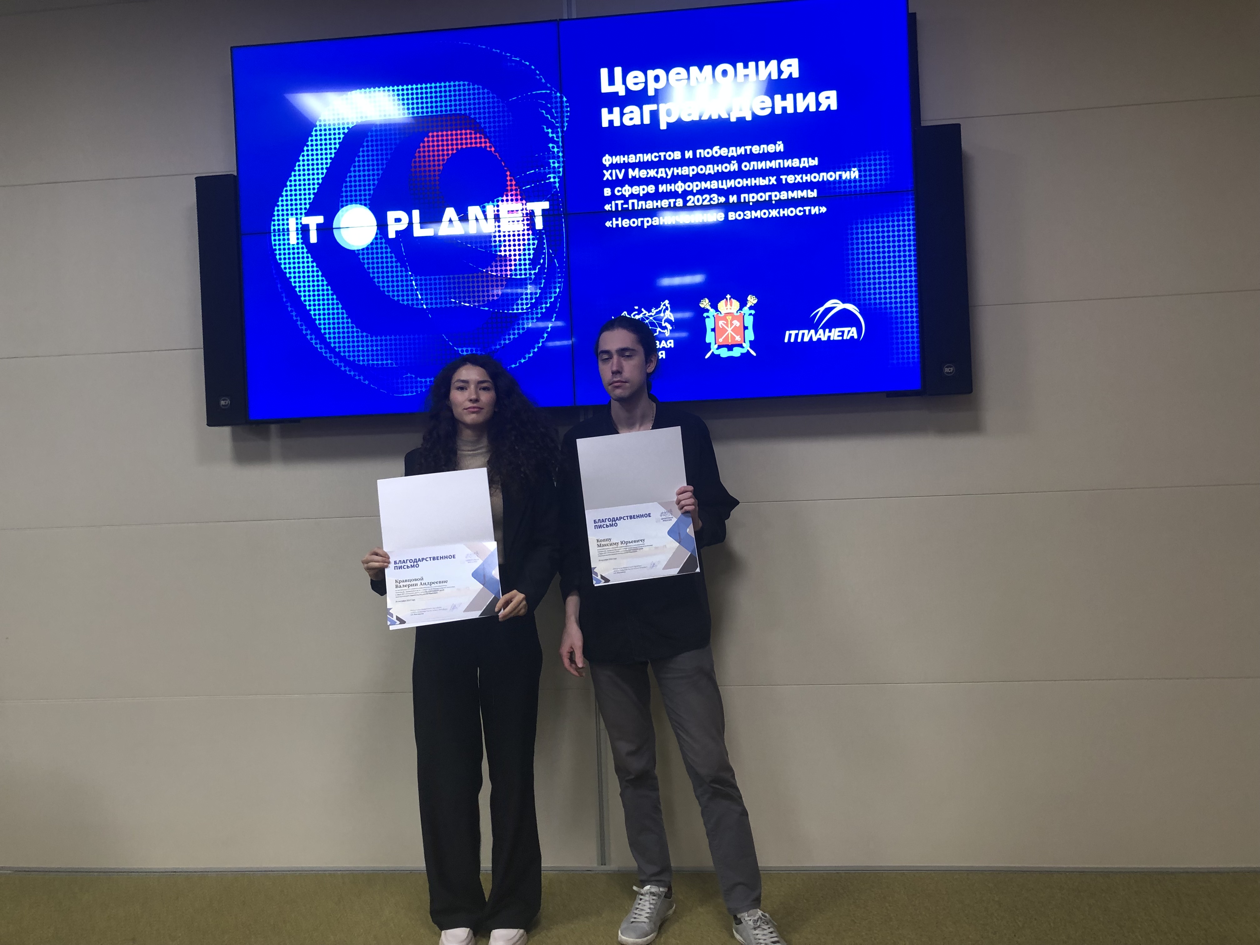 Финалистами «IT-Планета 2023» от СПбГУТ стали Максим Копп и Павел Титов (институт магистратуры), Данила Зырянов (выпускник факультета ИСиТ) и Валерия Кравцова (выпускница факультета ИКСС). Они успешно завершили участие в заключительных мероприятиях соревнований в мае этого года, а Павел Титов занял третье место.