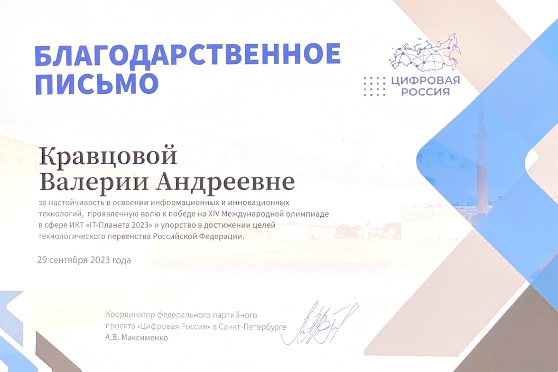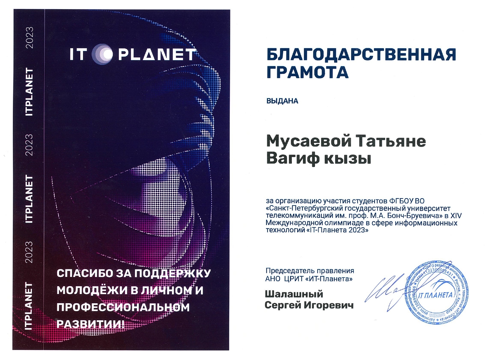 Организационный комитет Международной олимпиады в сфере информационных технологий «IT-Планета» вручил благодарственные письма студентам Санкт-Петербургского университета телекоммуникаций, которые прошли в финал проекта в 2023 году. Торжественное награждение прошло 29 сентября в АДК «Невская Ратуша».