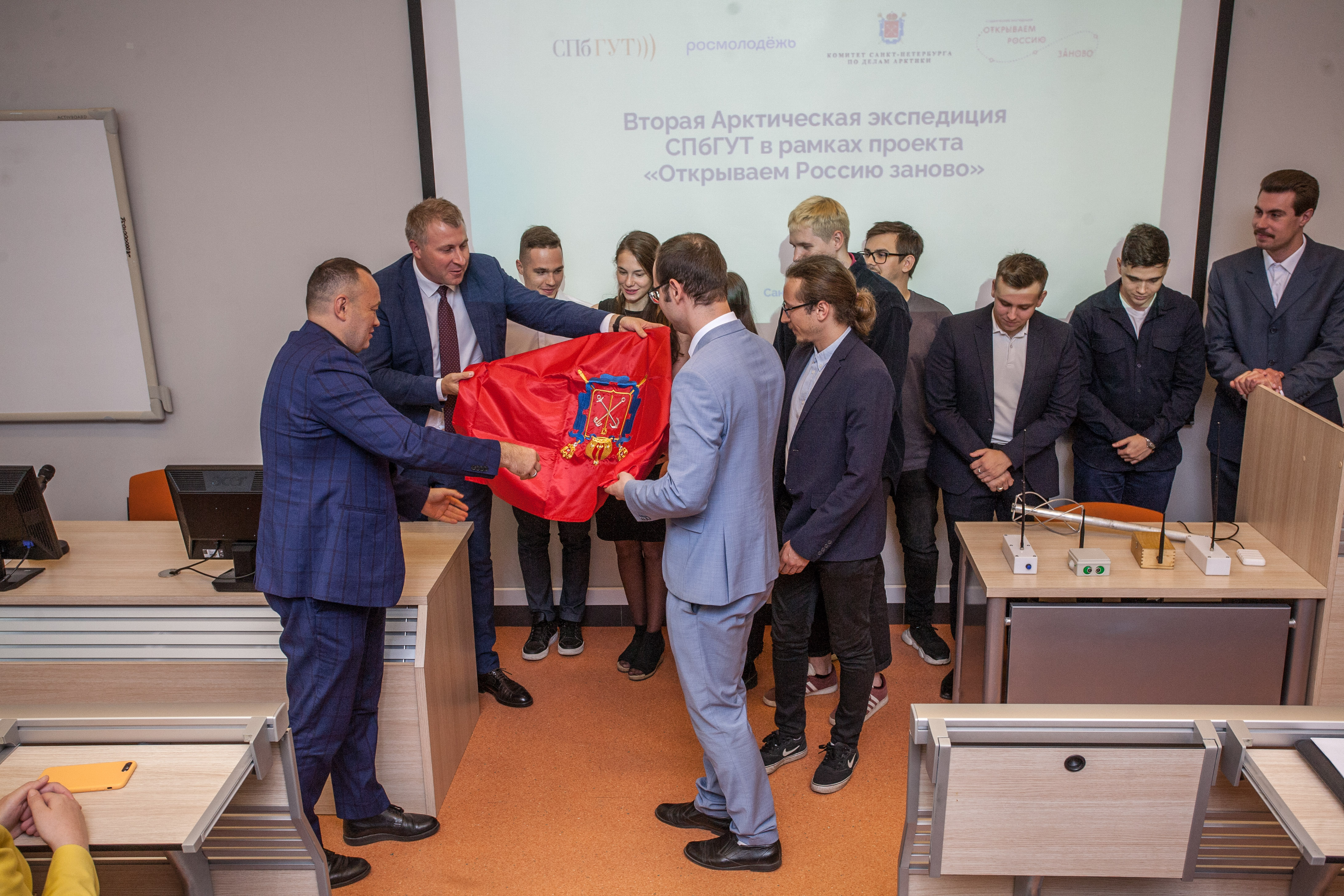 В конце мероприятия Андрей Анохин передал команде экспедиции флаг Санкт-Петербурга и выразил надежду, что СПбГУТ поможет закрепить положение Санкт-Петербурга в Арктической зоне.