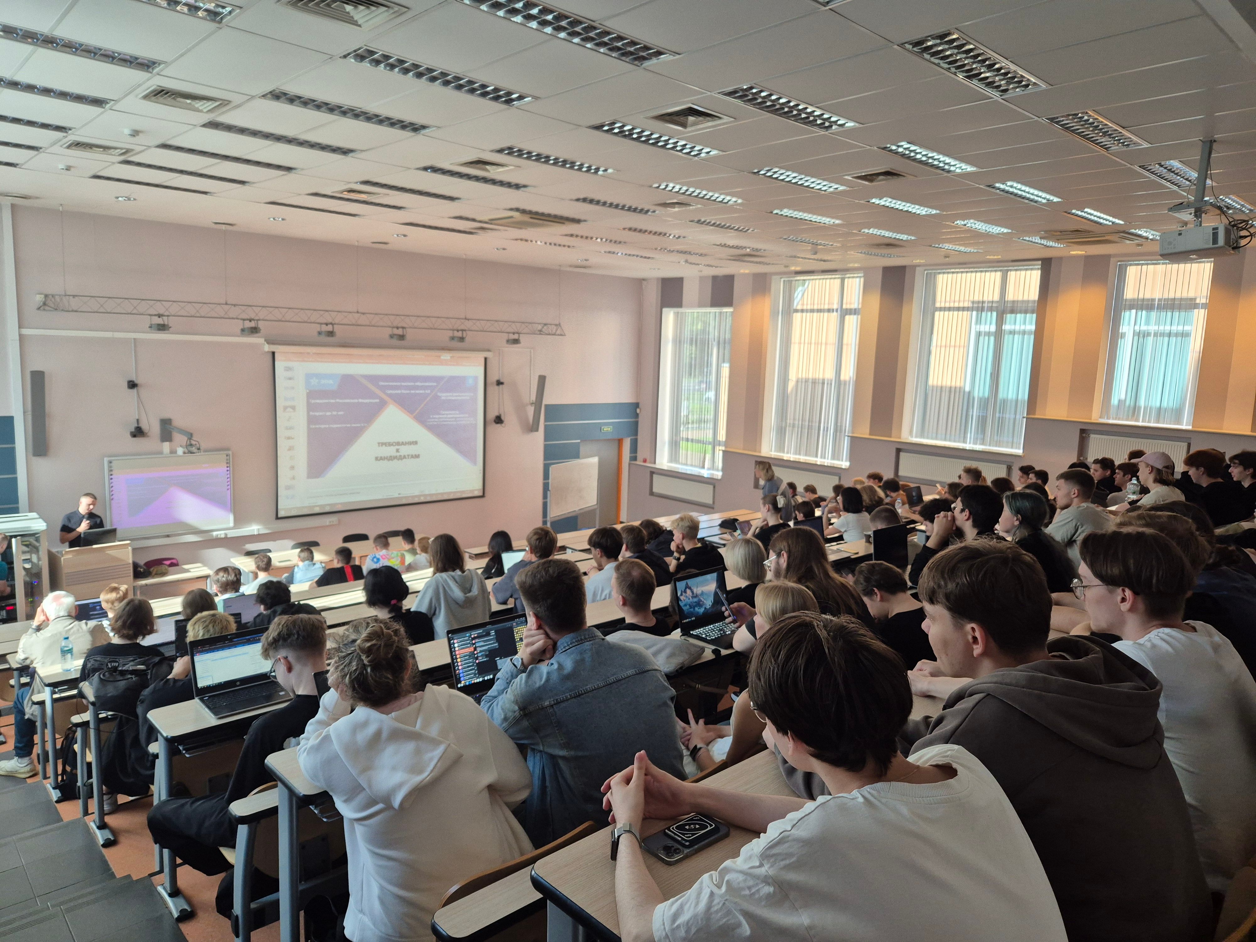 Перед студентами выступил старший научный сотрудник технополиса Илья Маркин. Он сообщил об условиях поступления и преимуществах службы в научной роте. Так, в течение года операторы проводят испытания в лабораториях, пишут научные работы и участвуют в конференциях по направлениям своих исследований.