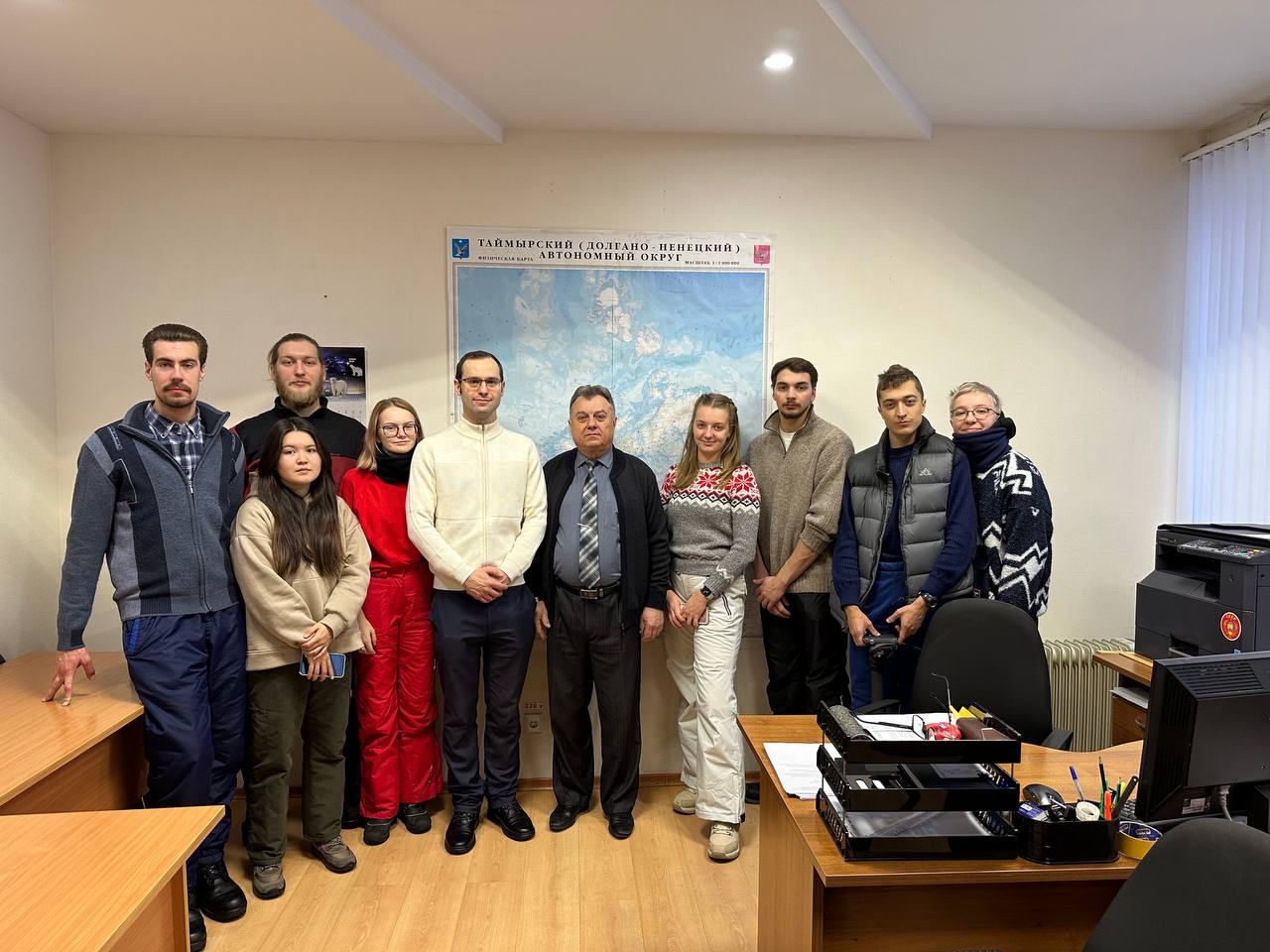 Понедельник начался с визита в администрацию пгт. Диксон. Нас встретил заместитель главы администрации Александр Дмитриевич Степанов. Он рассказал об истории Диксона, трудностях, с которыми сталкиваются местные жители, пожелал ребятам успехов в научной деятельности. Встреча закончилась коллективным фото и обменом памятными подарками.