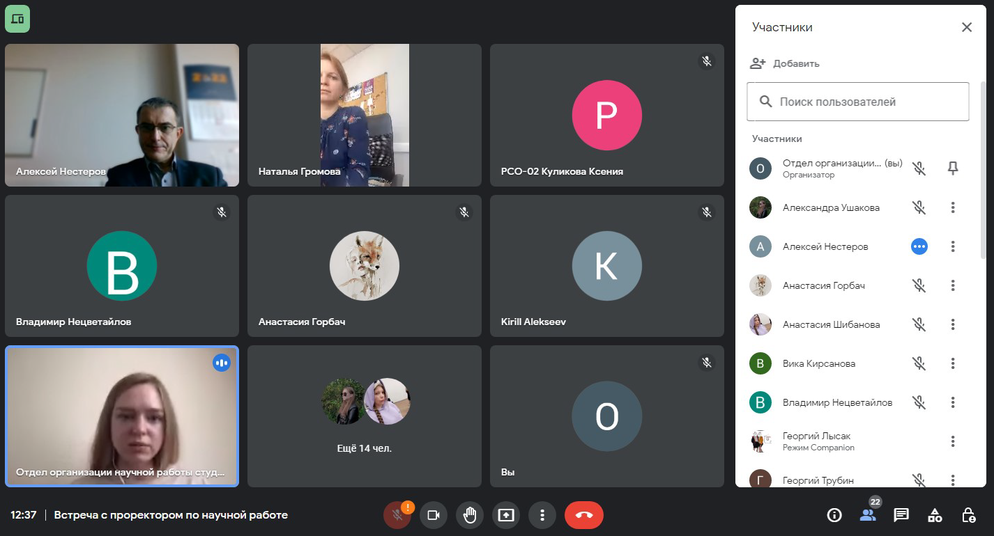 Во встрече также приняли участие начальник управления организации научной работы Алексей Нестеров, начальник отдела организации научной работы студентов Алина Задорожняя и главный специалист отдела Наталья Громова.