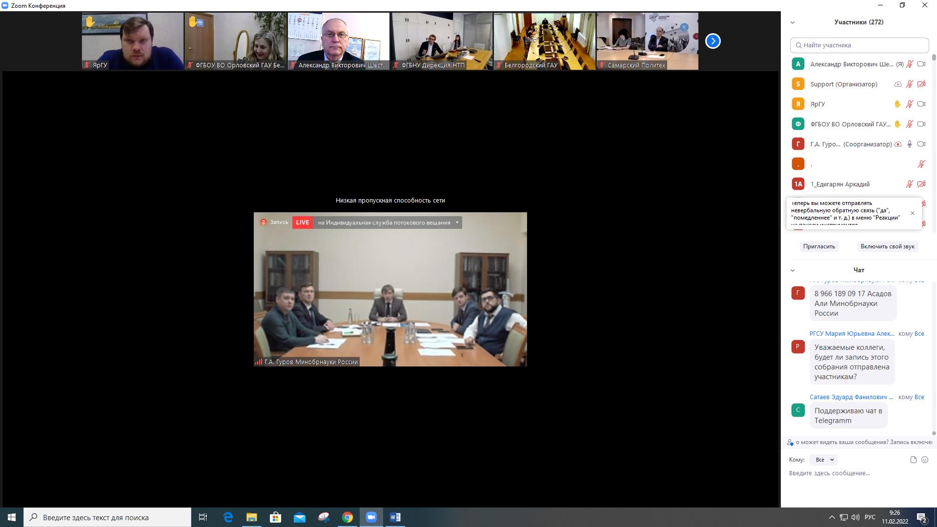 11 февраля состоялось тематическое совещание по вопросу предоставления грантов образовательным организациям высшего образования на реализацию мероприятий, направленных на поддержку студенческих научных сообществ. Организатором совещания выступило Министерство науки и высшего образования Российской Федерации.