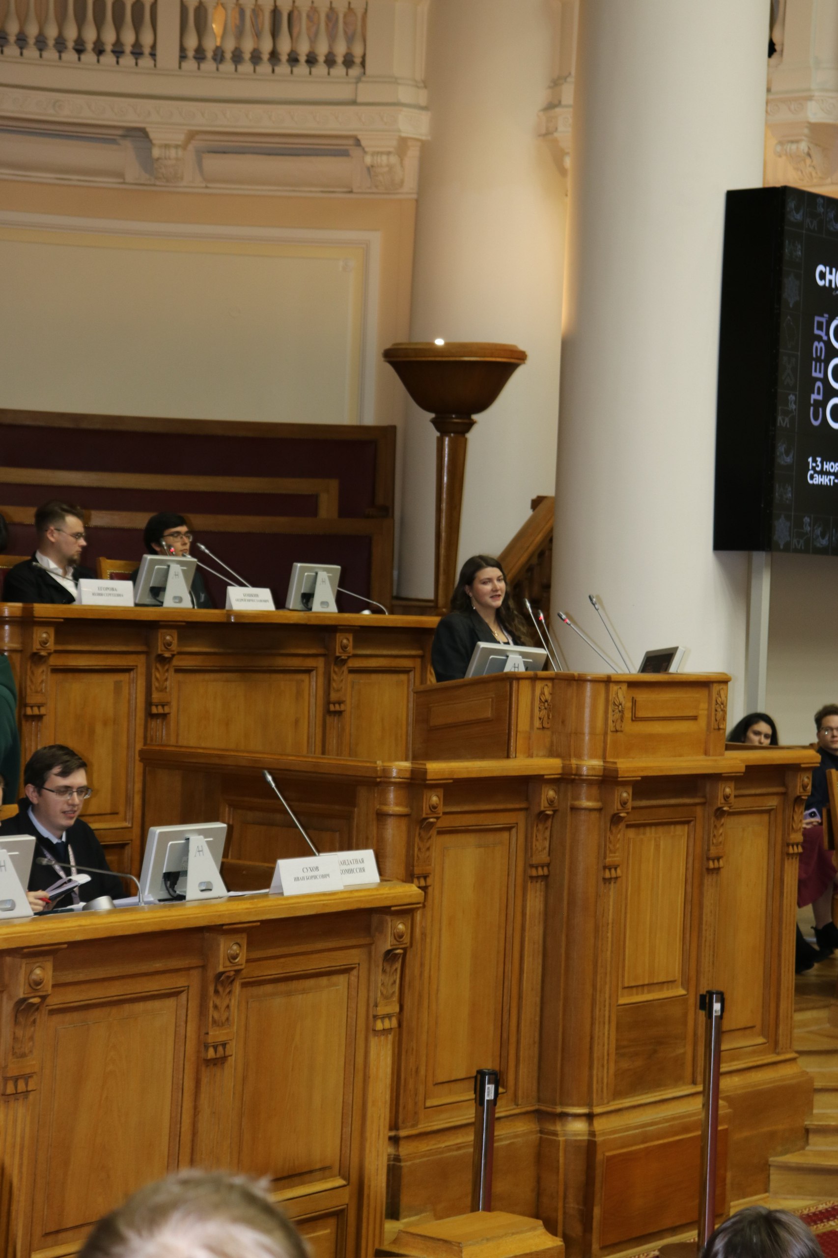 В начале ноября председатель студенческого научного общества СПбГУТ Светлана Подайко стала участником Первого съезда Студенческих научных обществ и Советов молодых учёных Северо-Западного федерального округа, который прошёл в Таврическом дворце.