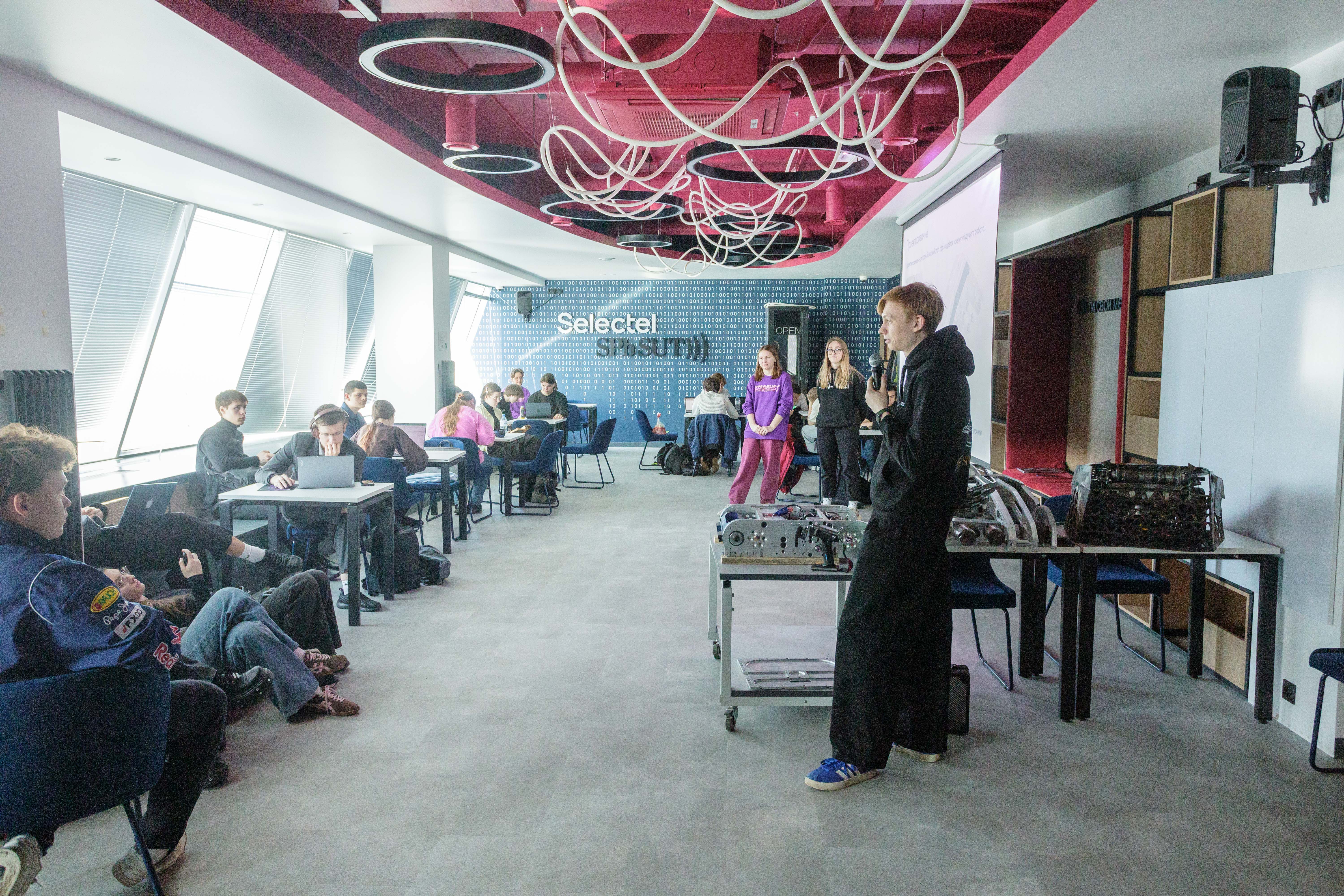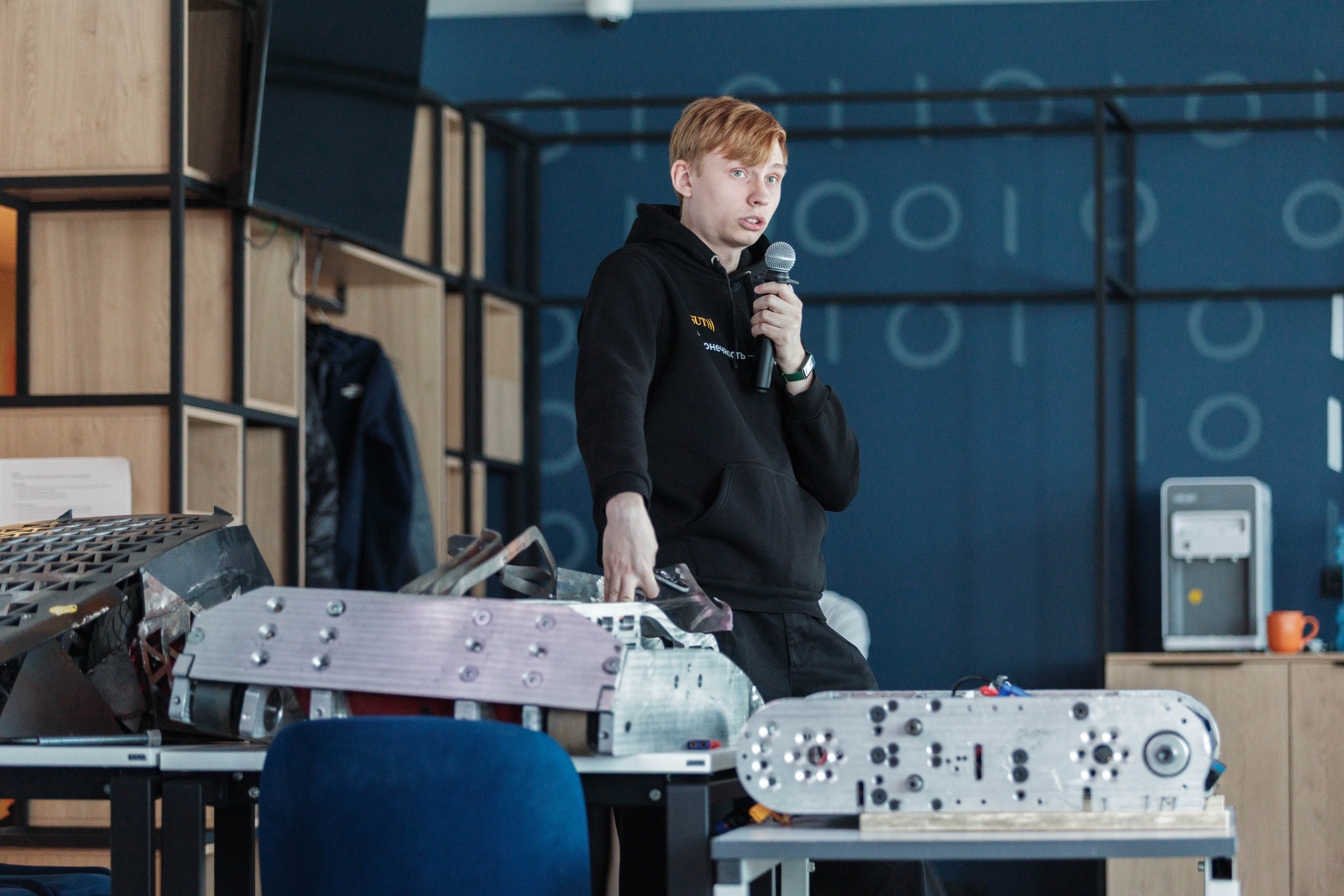 Спикерами стали разработчики команды СПбГУТ, которая участвует в «Битве роботов» с 2024 года. Анастасия Золотухина, Алёна Харлова и Кирилл Балан. Они поделились опытом реализации инженерных проектов, представили полный цикл создания боевого робота: от выбора концепции до выхода на арену.