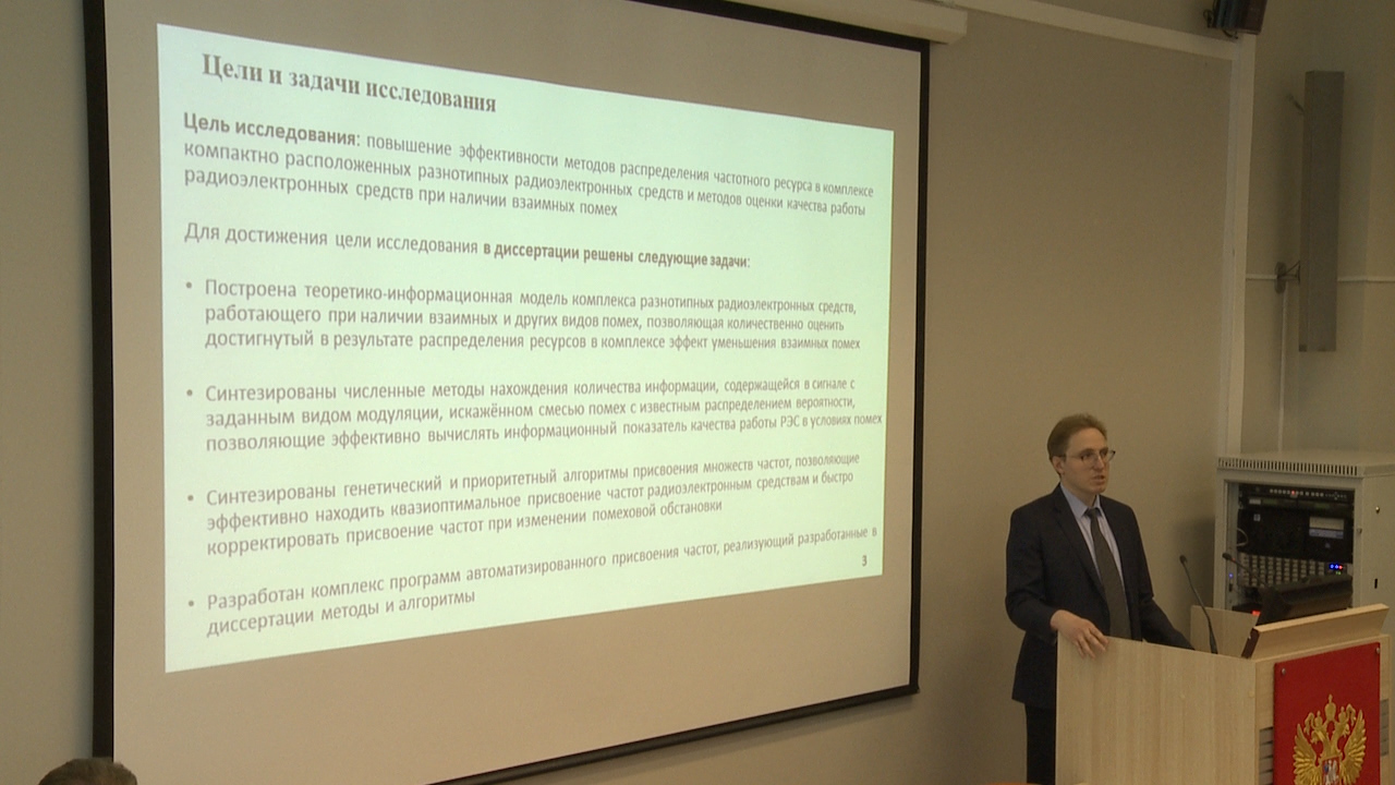 12 апреля в диссертационном совете 99.2.038.03, созданном на базе Балтийского государственного технического университета «ВОЕНМЕХ» им. Д. Ф. Устинова, Санкт-Петербургского государственного университета аэрокосмического приборостроения, Санкт-Петербургского государственного университета телекоммуникаций им. проф. М. А. Бонч-Бруевича, Силин Денис Михайлович, руководитель группы отдела разработки автоматизированных систем управления специальными средствами ООО «Гейзер-Телеком», защитил диссертацию на соискание ученой степени кандидата технических наук на тему: «Разработка математической модели и алгоритмов для устранения взаимных помех в комплексе компактно расположенных разнотипных радиоэлектронных средств».