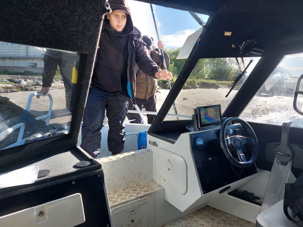 Часть группы ранним утром во время отлива отправилась на вездеходе, небольшой отрезок пути прошел по берегу, где еще совсем недавно была вода. Другая вылетела в Лопшеньгу на самолете. Из-за шторма самолет прибыл с небольшим опозданием, но, несмотря на непогоду, вылет состоялся.