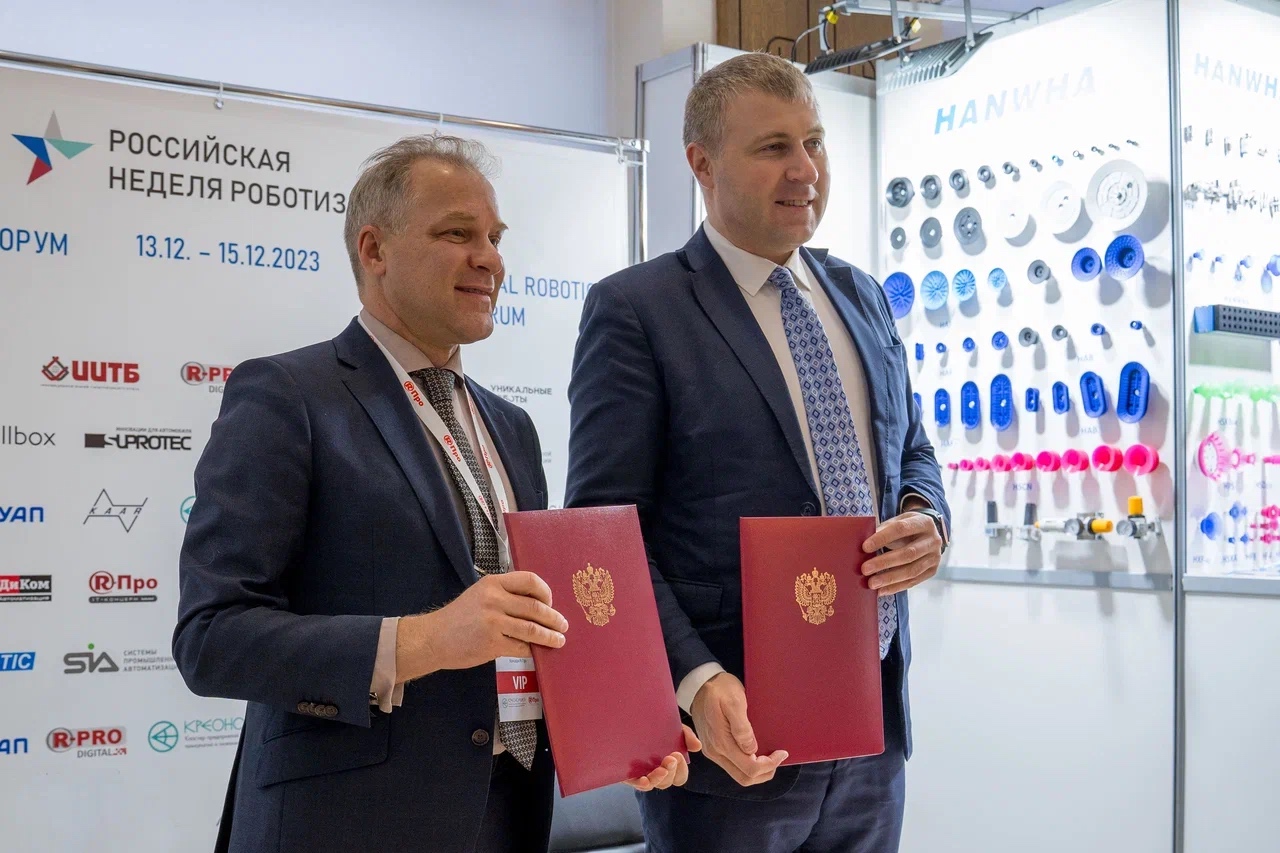 Ректор Руслан Киричек подписал соглашение о вступлении СПбГУТ в Кластер высоких, наукоемких технологий и инжиниринга СЗФО РФ «Креономика» с председателем правления Кластера «Креономика» Алексеем Кораблевым. Руслан Валентинович оценил экспозицию и последние разработки отечественных компаний в сфере промышленной роботизации, пообщался с представителями отрасли.
