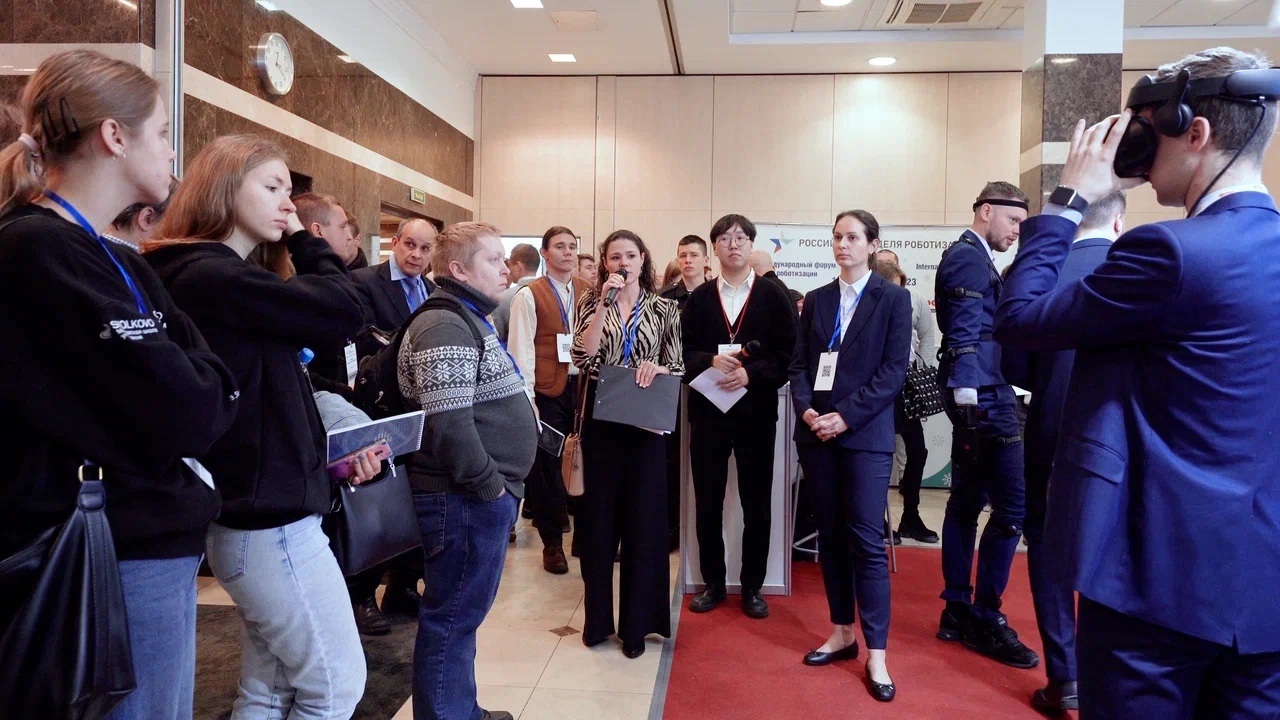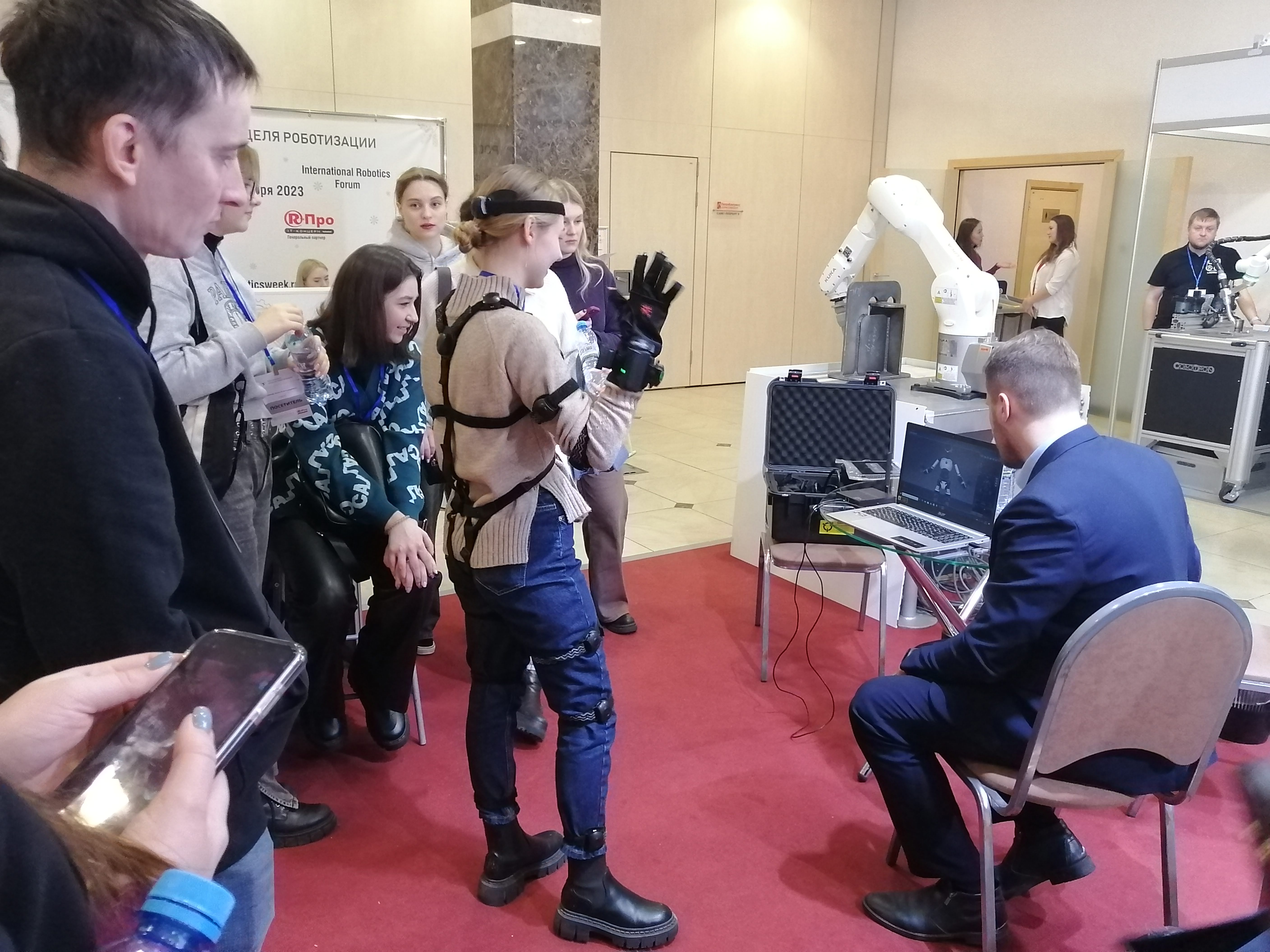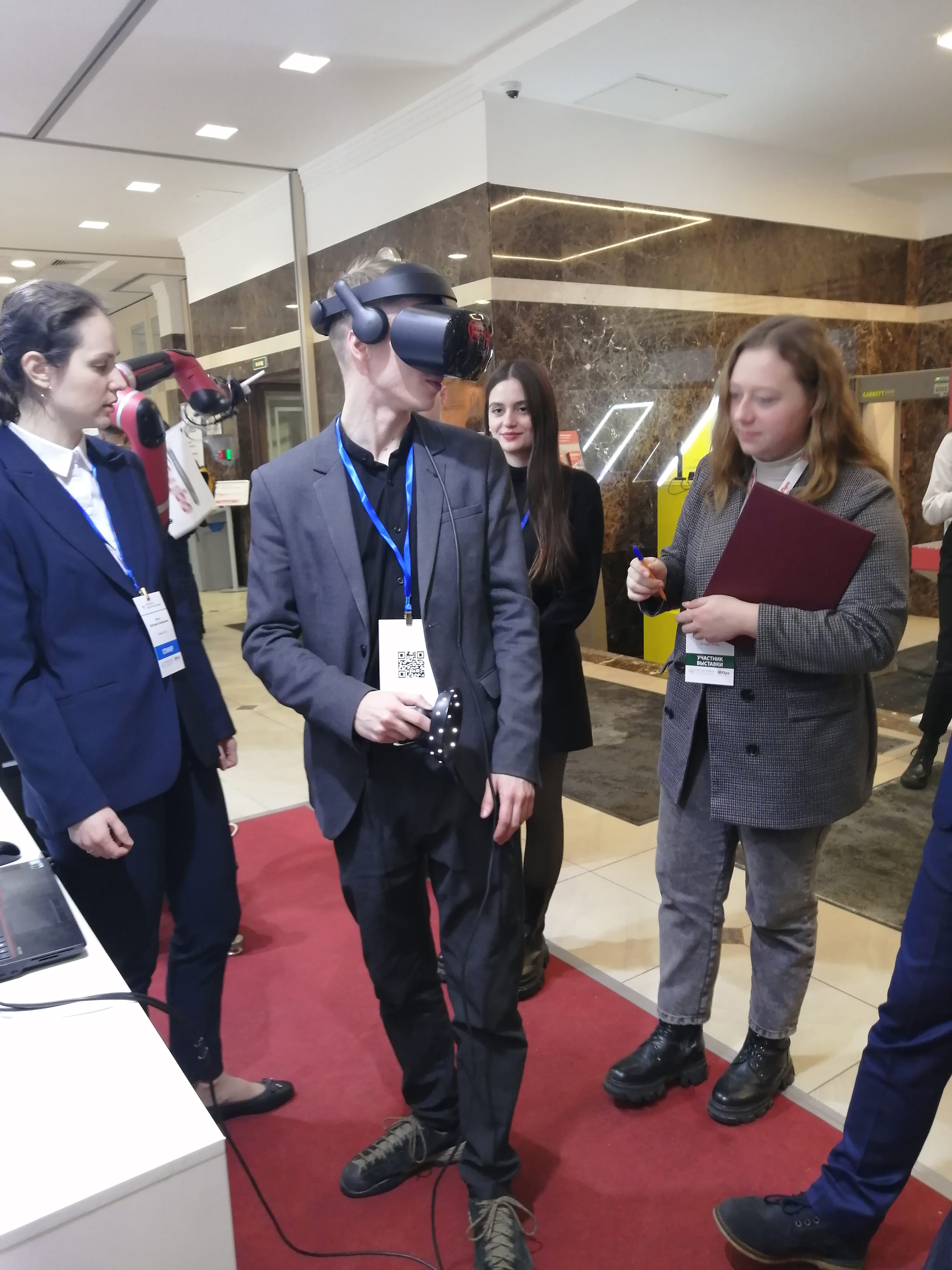 Активное участие в качестве слушателей принимали студенты и аспиранты СПбГУТ. Они примеряли костюмы с датчиками, гуляли по цифровому двойнику производства в шлеме виртуальной реальности, играли с роботом в шахматы, угощались йогуртами у робота-бармена, а самые смелые покатались на сервисном роботе-перевозчике.