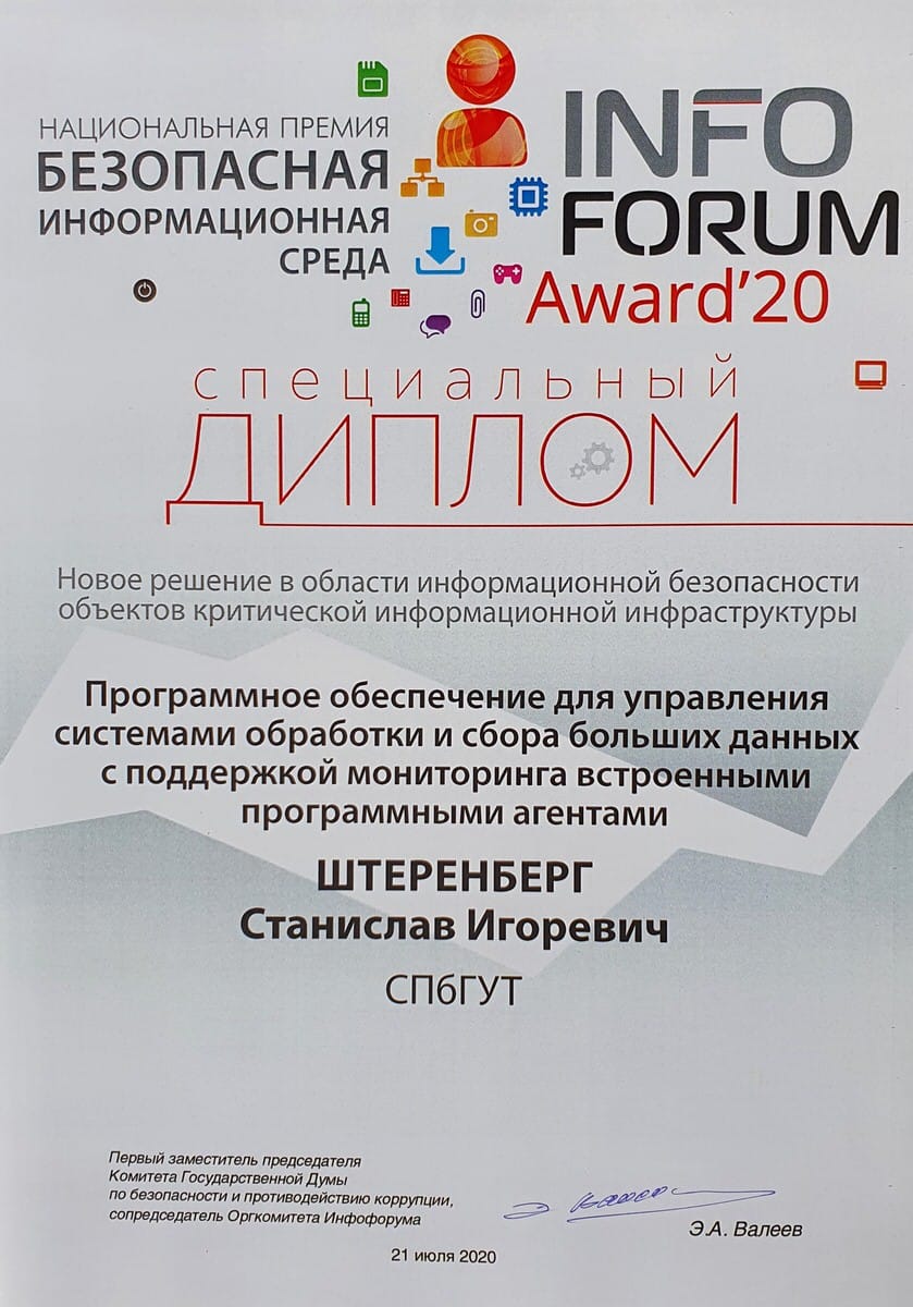 Старший преподаватель кафедры ЗСС, к.т.н., Станислав Игоревич Штеренберг стал лауреатом в номинации «Новое решение в области информационной безопасности объектов критической информационной инфраструктуры» с проектом: «Программное обеспечение для управления системами обработки и сбора больших данных с поддержкой мониторинга встроенными программными агентами». В работе предлагается методология преактивного управления, которая помогла бы уменьшить количество сложных ситуаций в работе отдельного сотрудника от внешнего и внутреннего нарушителя информационной безопасности, защите самого программного обеспечения для осуществления контроля учёта рабочего времени. Совокупность полученных научных результатов по проекту «Программное обеспечение для управления системами обработки и сбора больших данных с поддержкой мониторинга системы встроенными программными агентами» позволяет достигнуть поставленную цель – обеспечить преактивное управление систем контроля учета рабочего времени в распределенных информационных сетях, направленное на уменьшение времени выявления вторжений с использованием Больших данных.
