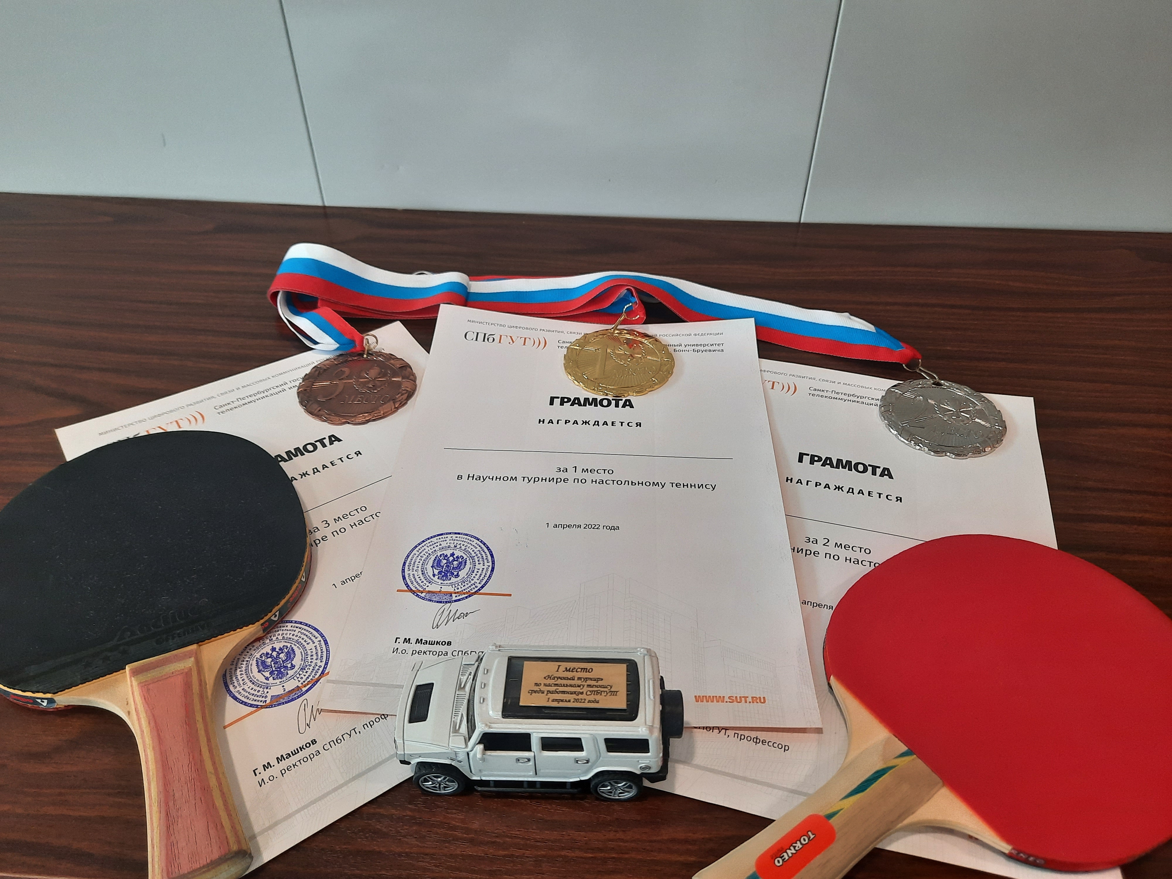 1 апреля в СПбГУТ состоялся очередной, шестой по счету, «Научный турнир» по настольному теннису. Самые спортивные ученые университета боролись за главный приз – игрушечный автомобиль. Турнир оказался не самым многочисленным, но зато самым научным. Впервые в нем встретились представители администрации университета: и.о. ректора Георгий Машков и проректор по научной работе Александр Шестаков.
