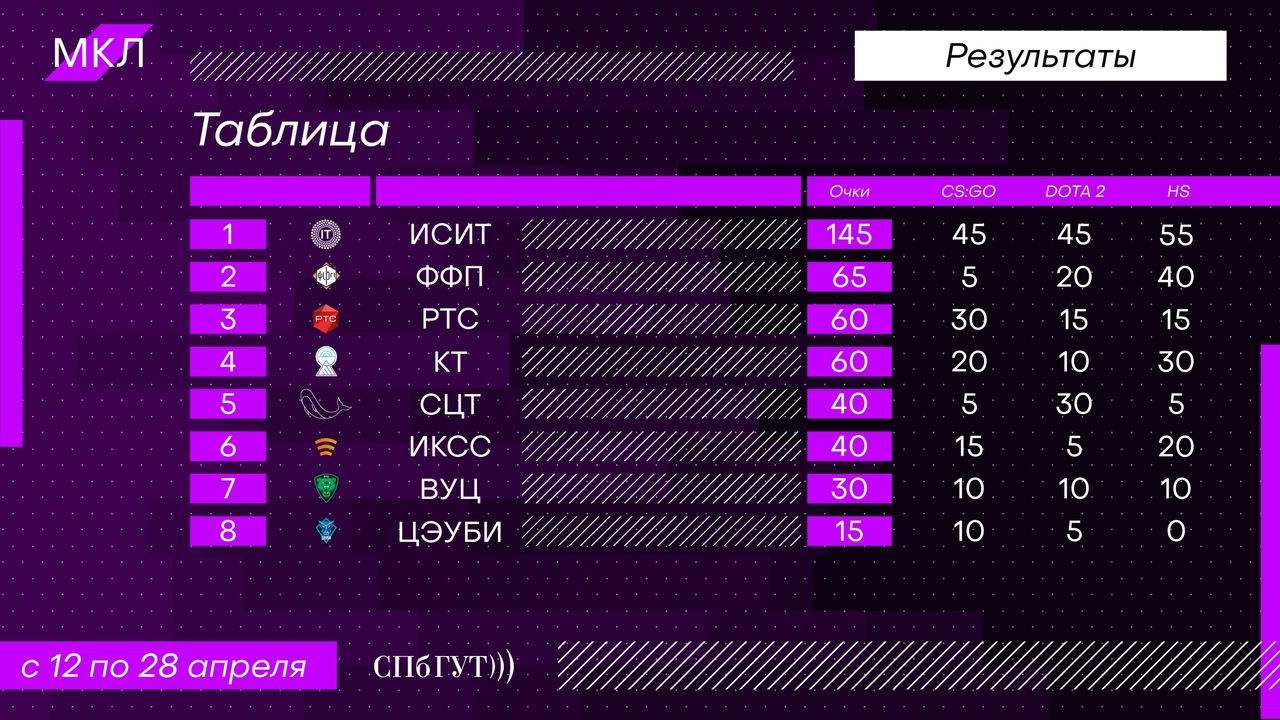 Победителем Межфакультетской Киберспортивной Лиги стал факультет ИСиТ, который победил во всех трёх дисциплинах. Отрыв по баллам был более, чем в 2 раза! На втором месте - факультет ФП, на третьем - РТС.