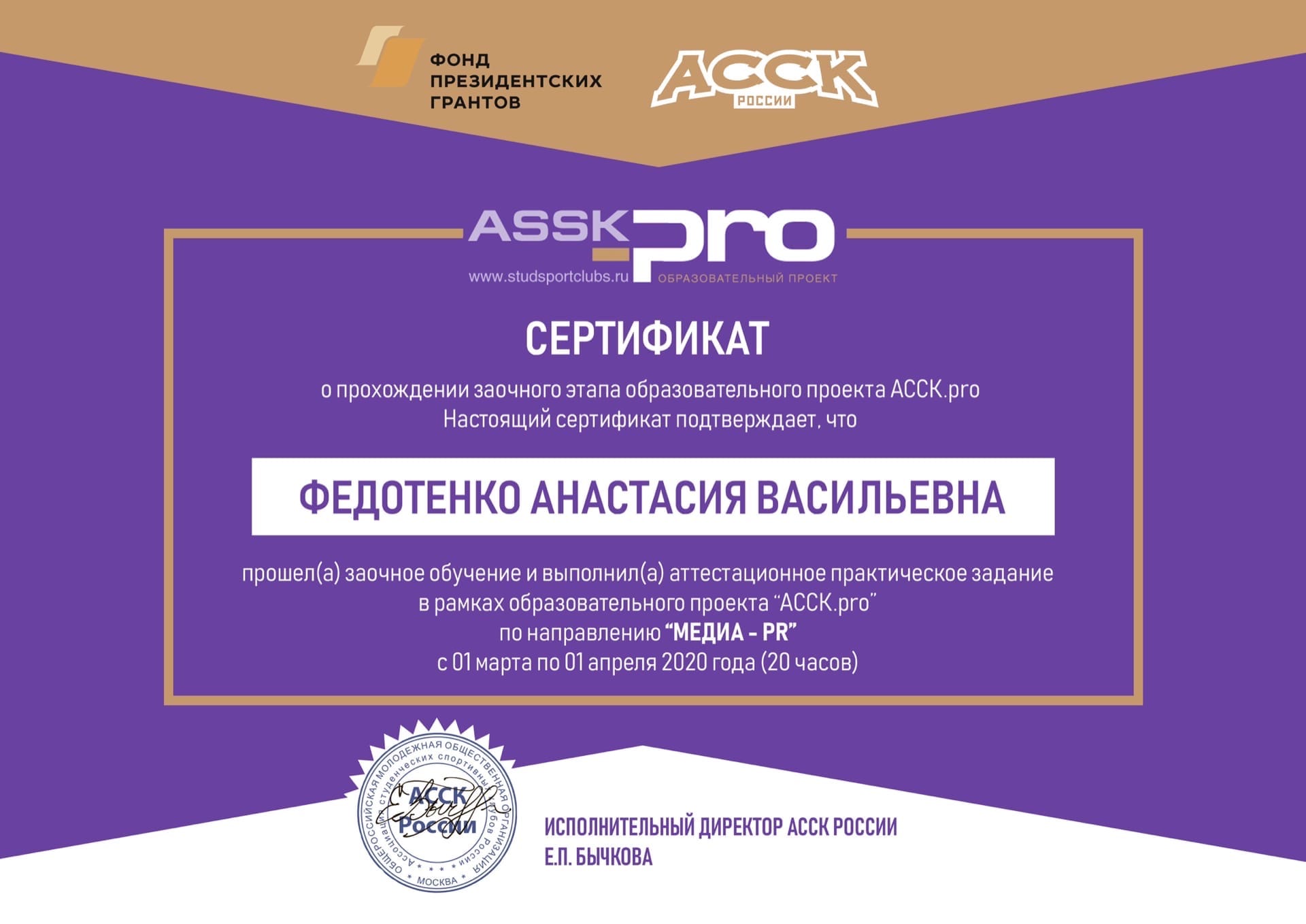 С февраля по апрель 2020 года проходил заочный этап образовательной программы «Ассоциации студенческих спортивных клубов России» – «АССК.PRO».